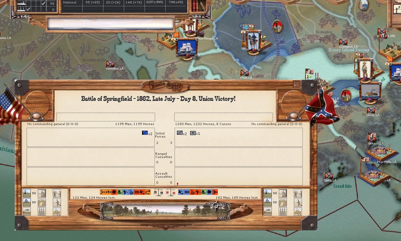 In Mississippi, the USA advance from the South is in full swing. The attacks come from the river. Port Hudson and Baton Rouge have fallen. Forrest remains entrenched at Springfield. In the North, Crittendon's Corps has arrived at Grant's location. A USA offensive seems inevitable aimed towards Corinth and Memphis.