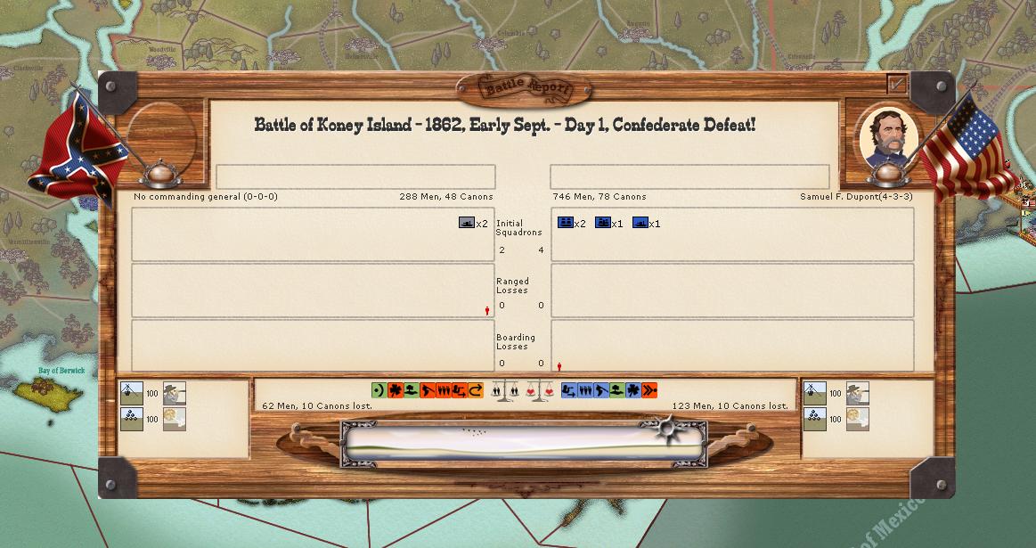 USA Army of the West captures Fayette AR. USA forces are once again repuled at Galveston. Crittendon's Corps moves towards Vicksburg, Jackson falls. Other theatres remain quiet, but the Mississippi and Arkansas managed to slip by USA naval elements into Mobile Bay. Notably, USA has taken point lead and the casualty gap is growing.