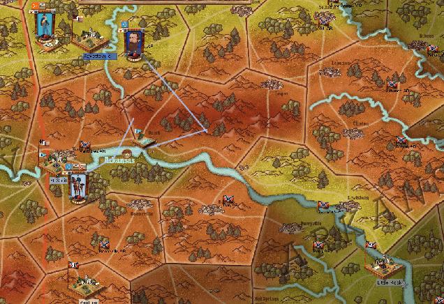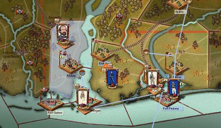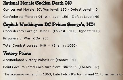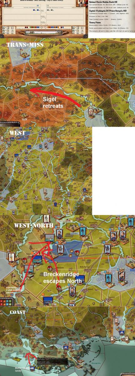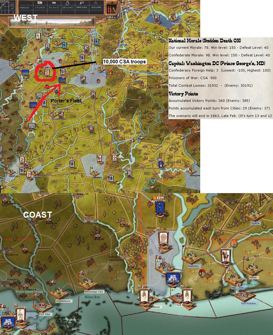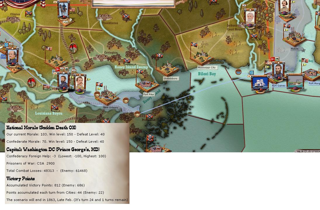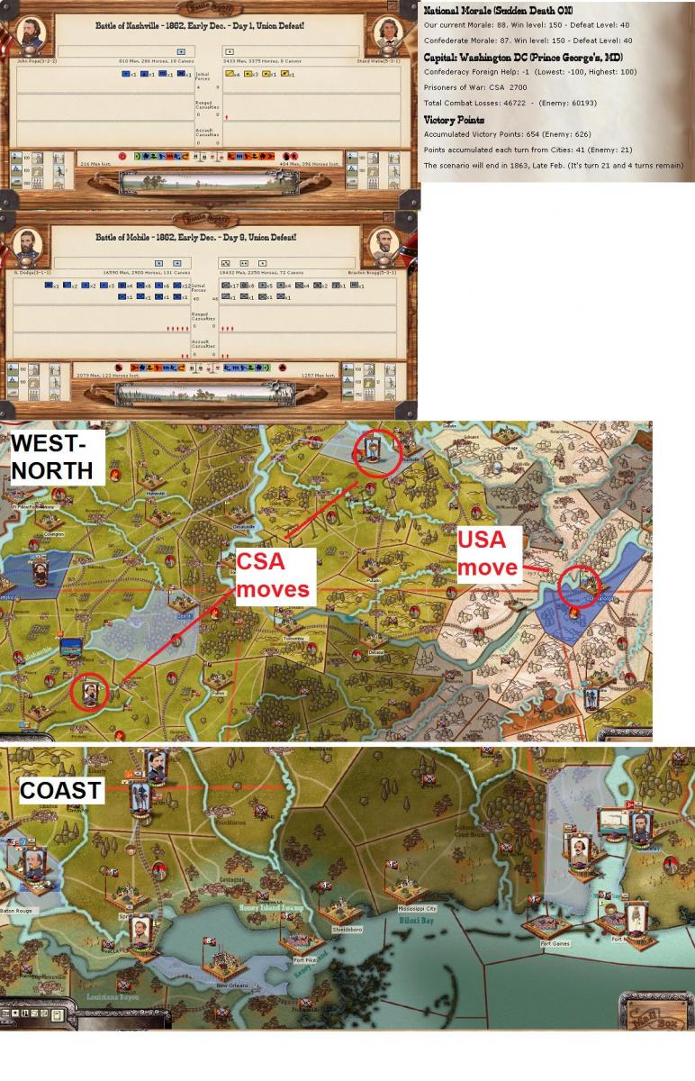Frozen weather at turn one around Memphis told me there will be no rapid advance so I decided to strengthen up and move when weather improve. After battle of Corinth where Union army of 50000+ lost to CSA army of 25000 I decided not to waste time with well entrenched rebels and went for weakly defended Chattanooga. In the meantime Butler arrived at New Orleans which was defended by rather strong force under Polk. Landing there was out of the question so I decided to knock out forts first to get supplies, points and clear the way for navy than turn on Mobile. That drew Polks attention who left New Orleans practically undefended and Dodge with some 3500 troops seized the opportunity. From than on it was basically playing for points by holding objectives and strategic towns. At last couple of turns I managed to take Memphis and even capture Beauregard's HQ but Breckenridge escaped engagement twice.