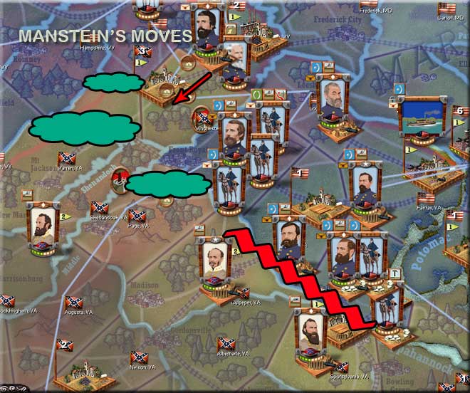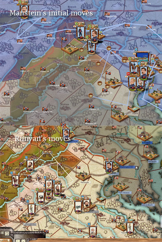 The primary battle this turn is at Winchester Virginia. Both sides send fairly large cav screens into that city. The turn ends with Runyan in possession, Jeb Stuart being the trump card. Manstein does, however, capture Manassis and Manassis Depot on day nine. Inexplicably Runyan failed to destroy it.
