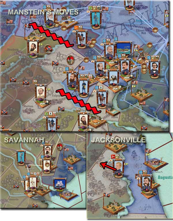 On the coast at Savannah Manstein has sent a militia element inland to wreak havoc. Jacksonville Florida, a strategic point, falls to Manstein, raising Union morale.