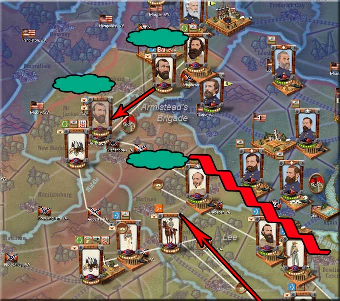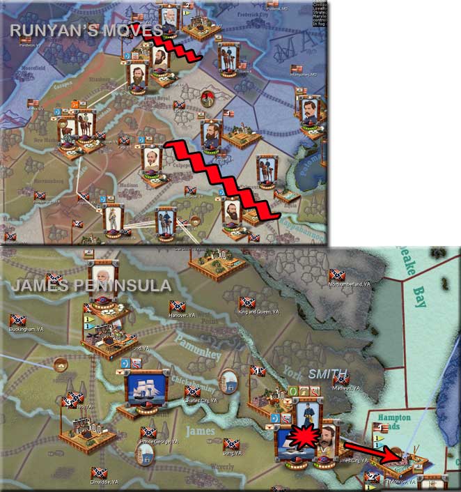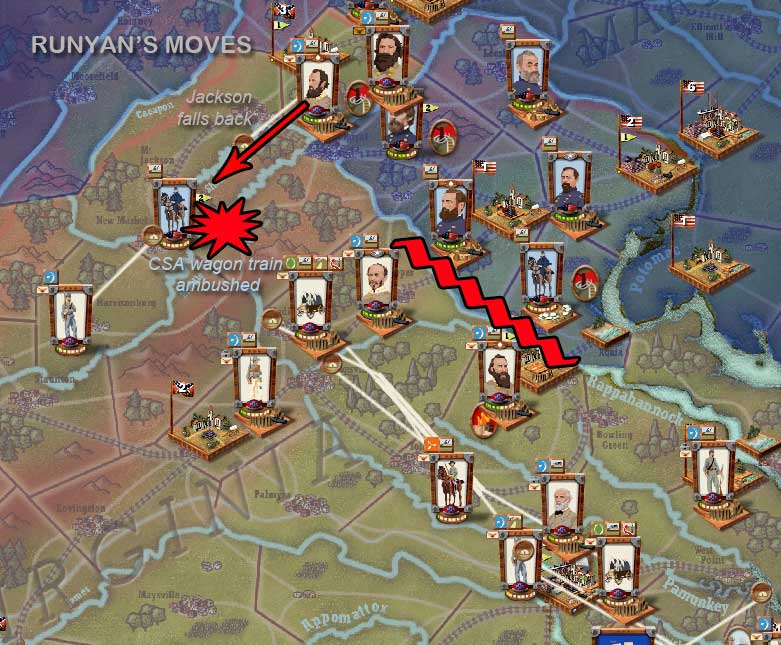 Runyan is sending Stonewall to reinforce Stuart at Winchester. He assumes a defensive posture in the other regions. He's gathering a reactionary force in North Carolina.