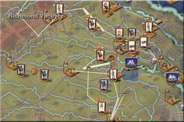 Manstein's relentless cavalry assault has forced Runyan to permanently station elements all up and down the railroads extending from Wilmington to Richmond. The Union navy has placed a blockade on Richmond as well, forcing Franklin Buchanan's James Squadron to emerge from the city. A battle is set for next turn.