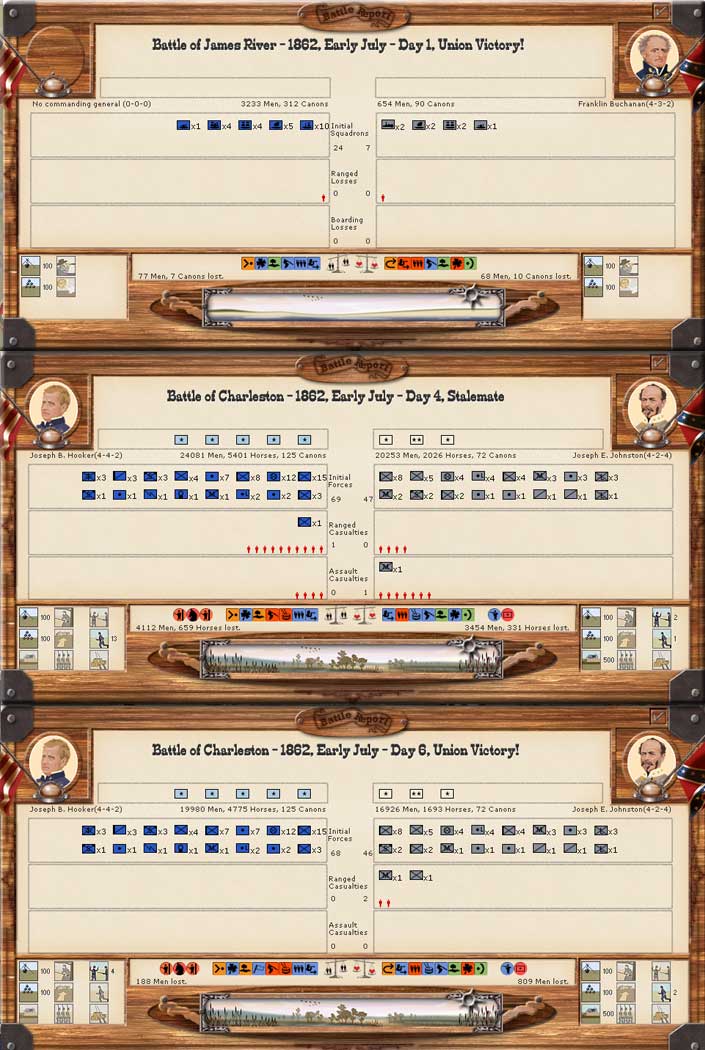 At Charleston, Dahlgren's fleet arrives in the bay taking 141 hits. The troops are preparing to offload to Fort Johnson, the southernmost Fort. Runyan has two divisions defending the city. At Jacksonville Walker has been repulsed.
