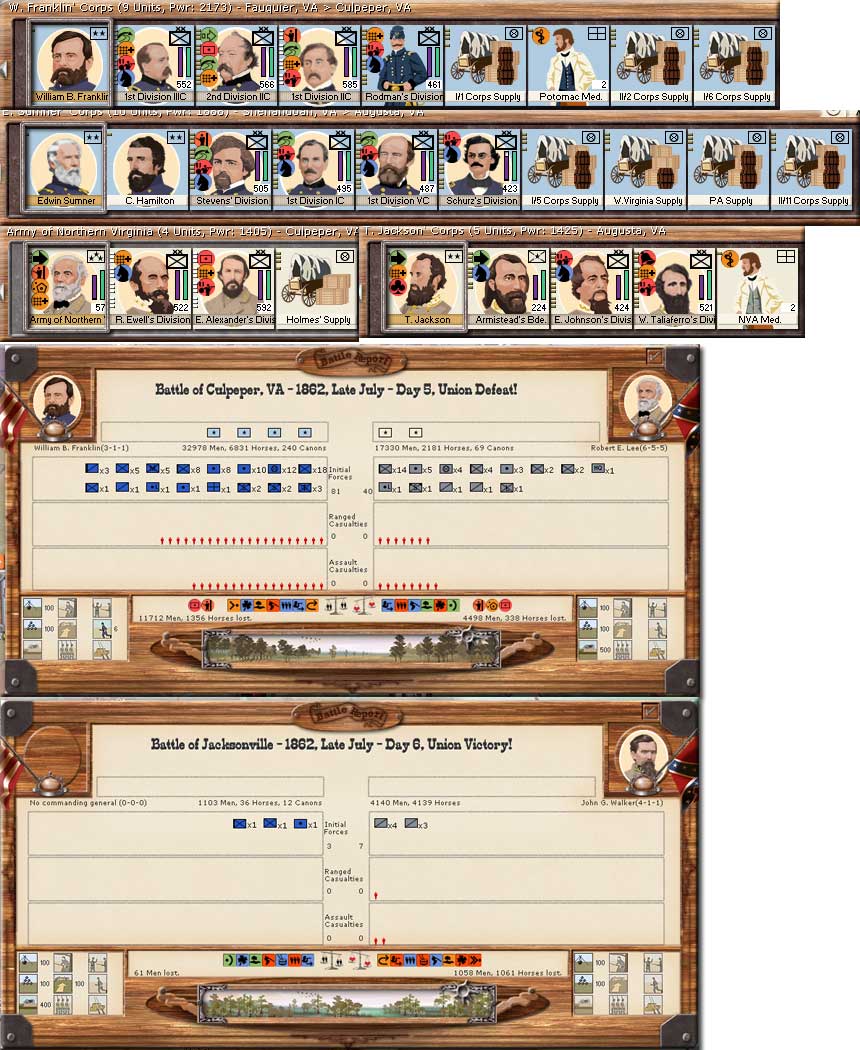 William Franklin's Corps arrives in Culpepper Virginia on day five. Assisting him is Edwin Sumner's Corps. Marching to the sound of the guns is Thomas Jackson's CSA Corps. The battle lasts for several hours. Franklin rolls luck, 51-49. Both sides open up at a range of five, but the Confederates are well-positioned. Lee's 69 guns, an assortment of 20 and 10 pounders, inflict massive casualties on the advancing Union lines-210 hits! The assault phase is little better for Sumner. Another 170 hits convinces them to finally flee back to Manassis Junction. Although casualties are heavy on the Union side, all seven divisions involved contributed in so no one division was severely mauled. Most elements lose in the range of 10 to 20% strength. Jackson's assisting Taliaferro's Division took the brunt of the casualties for the Confederates, ironically. Still, it's only a 10% hit on total strength.