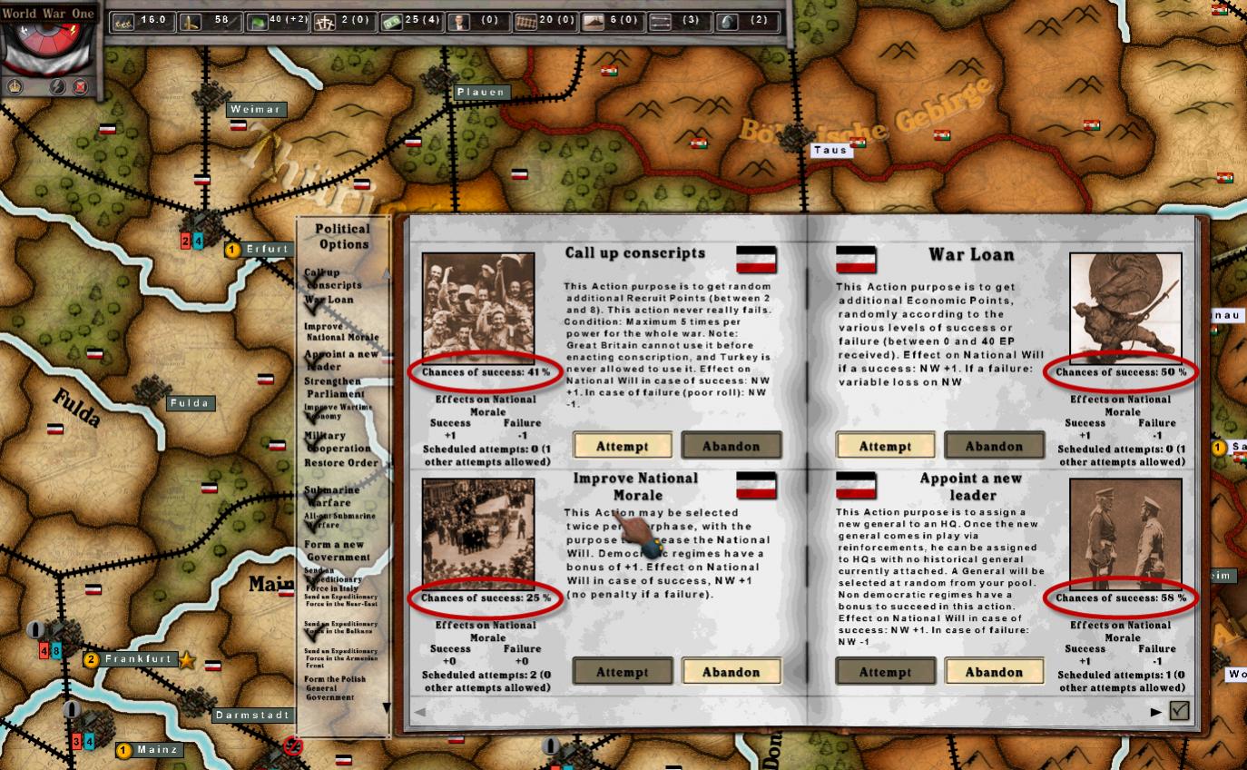 Germany Parliament is at +2 level, so with that +2 and the +1 modifier for Germany, Germany succeeds with this political action on a 4 or higher on 2 x 6-sided dice. Needing a 4+ means only 3 possible rolls fail (out of 36 possibilities), which also means 33 out of 36 possibilities succeed. That's an 92% chance of success (and an 8% chance of failure).