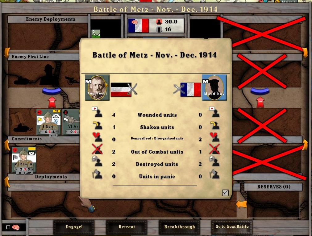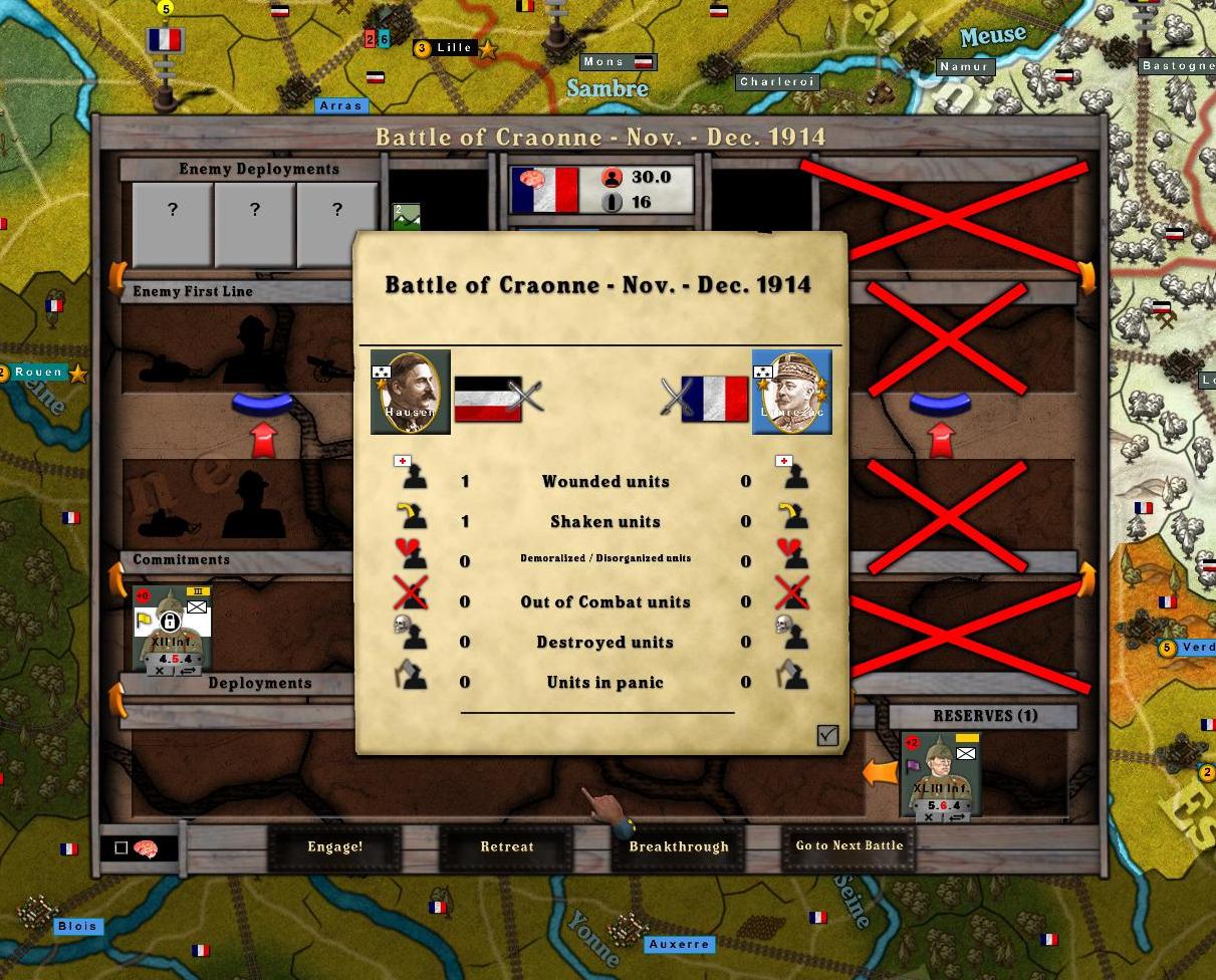 In the Entente game before it, they attacked straight through the border (Kronprinz Plan), swept me away near Luxembourg, and were stopped only after they repeatedly failed to take Reims on their push toward Paris, but it was tough call which one of us was more exhausted.