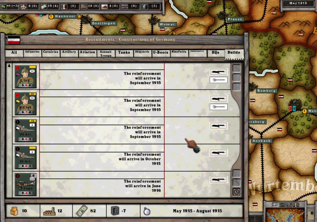 Germany has been producing new units since last September. The first ones are just now arriving. I have concentrated on infantry and artillery. I have built no new air units (lack of new techs to make it worth it), or subs.