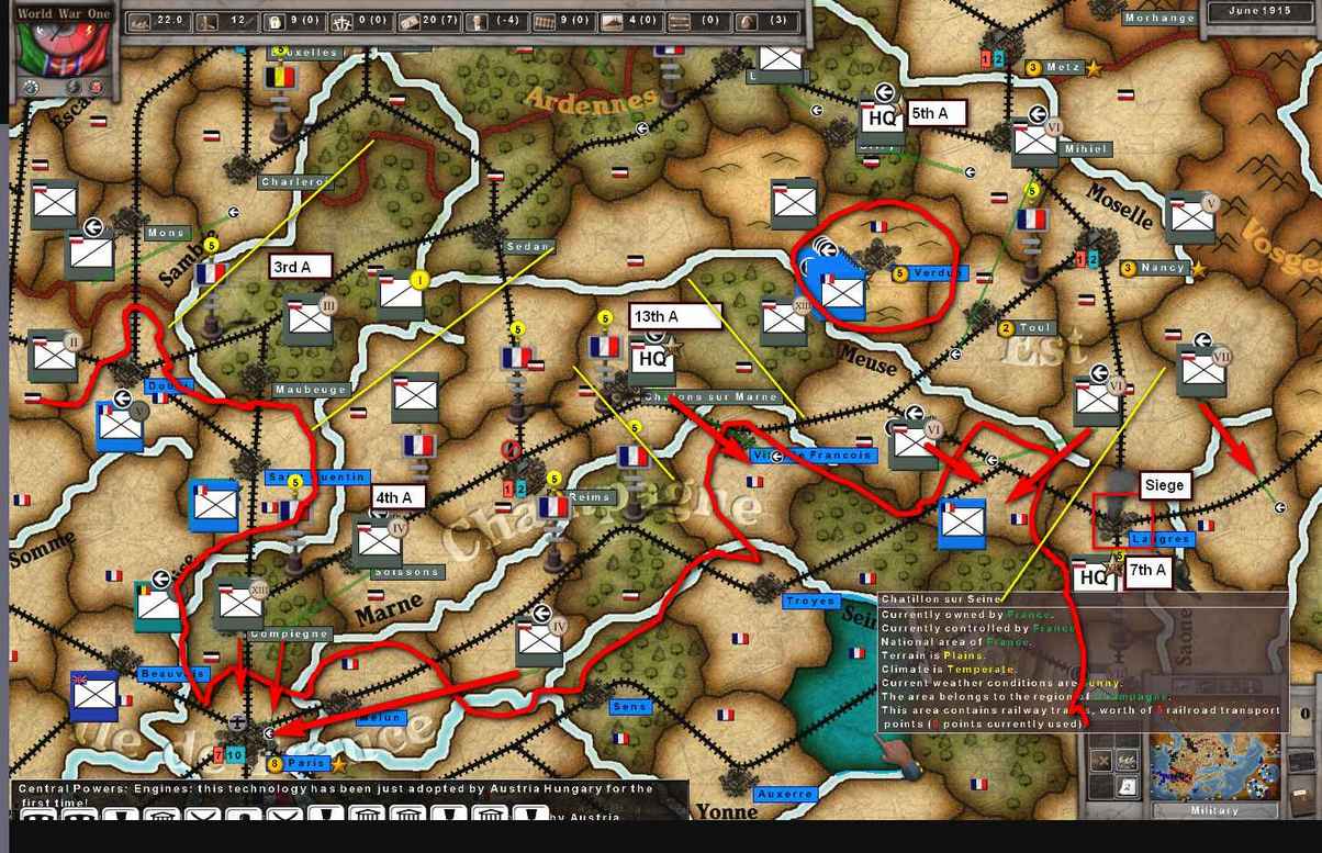 North East France will see some more offensive action. The 7th Army is hung up at Langres due to a lack of artillery. The 6th Army is free to push south, and the 5th Army will be forced to contain Verdun for a while.