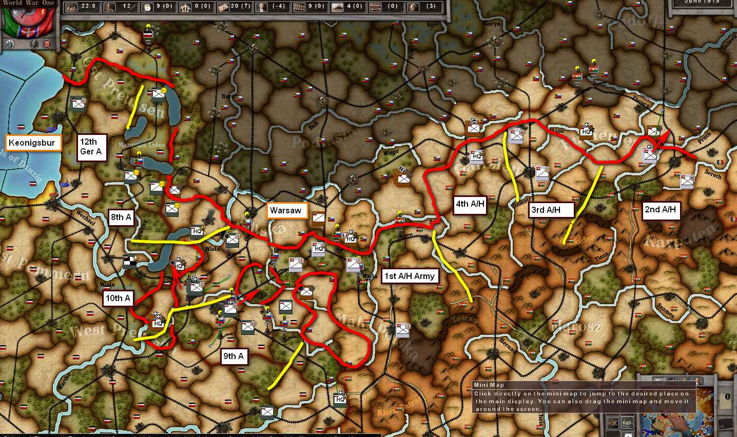 The Eastern Front has been heating up mostly due to the Russian Empire's continued attacks. It is suffering major losses, and these will soon be increased by the actions of the German 8th, 9th and 10th armies. It is hoped that Warsaw will fall this summer.
