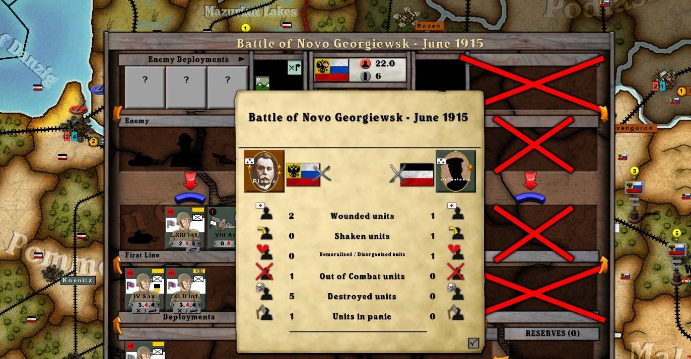 Here is the battle results screen for Kolo. The Russian units were out of supply-it looks like this has a big impact on their ability to fight. There bad situation was the result of the Russian ai sending 2 armies on an offense toward Thorn-a bad move