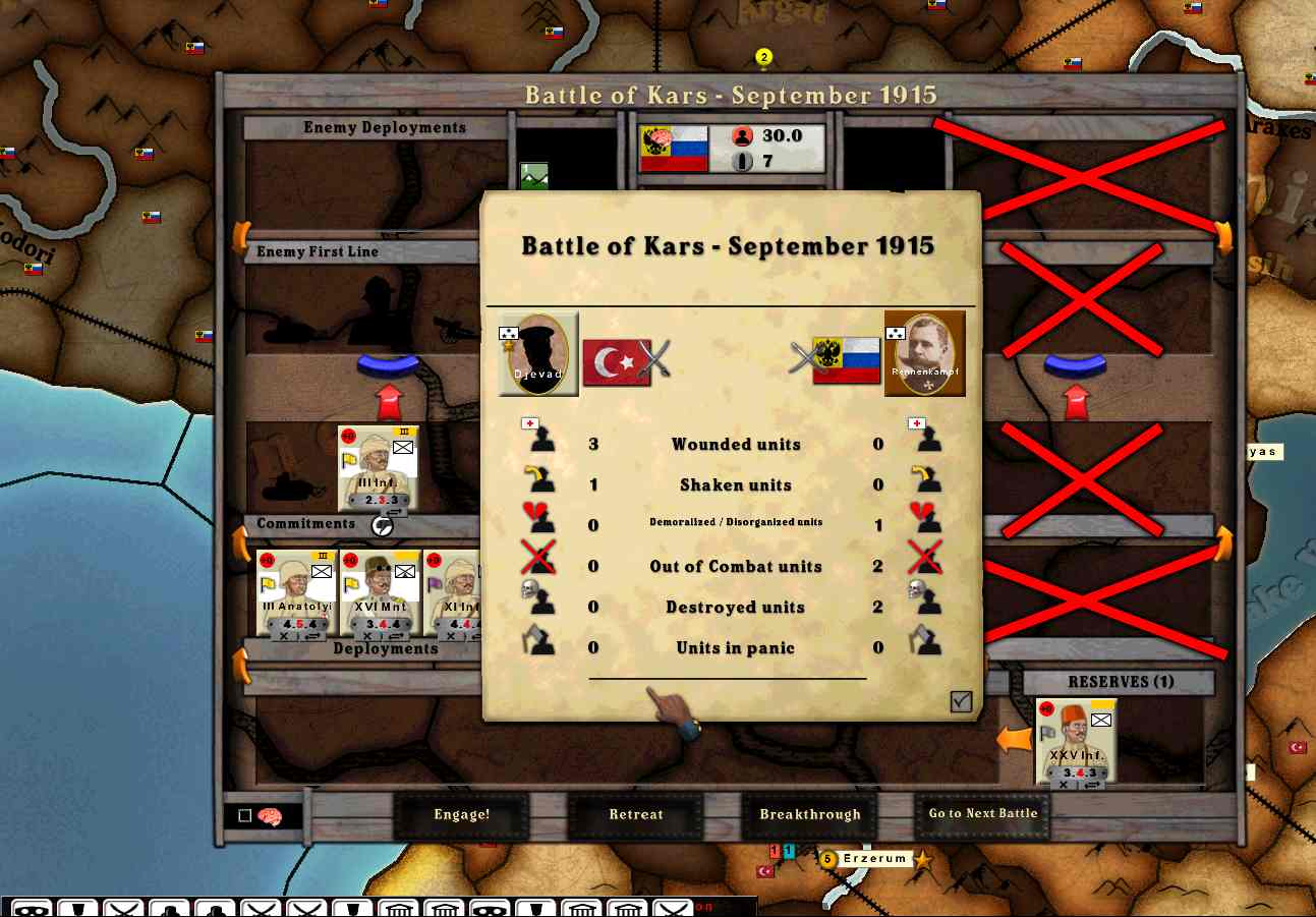 The O.E. seemed to be in a good situation for their required Grand Offense-one could hope. The result was a reliefe. The NW must have a significant impact on the combat. The Russians have better units and were defending in the mountains. I did not know what they had to defend Kars with, but I was aware that units were being moved to the Polish, Galician areas. I figured on a good numerical superiority-at least.