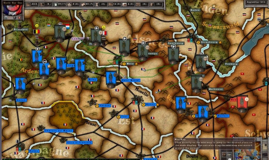 The game seems to running in a dependable fashion, so it is time for an AAR. I’m using the G Beta patch-playing as the Central Powers. Starting Situation The German General Staff has, after all due consideration, decided to keep the Schlieffen Plan. The alternatives hold no prospect for achieving a situation that would ensure a decisive victory in a reasonable amount of time. There are also other considerations; the most popular idea among the people (apparently) is for a major attack against France. To keep the highest possible National Will (NW), France must be the target.