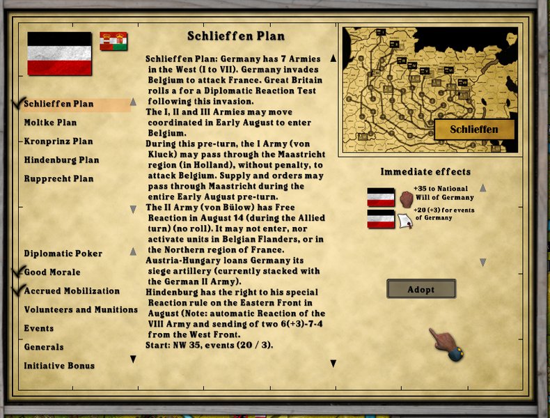 It seems like a good idea to choose the high moral option giving 5 points in moral for the Army. The second choice is somewhat more difficult. In this case I chose the "accrued mobilization". This gives 5 extra reserve corps-4 for the east and one to the west. This seems to be a prudent thing to choose if using the Schlieffen Plan. There are a couple of bold Russian plans that, if chosen by the ai, could make things very difficult for the German player.