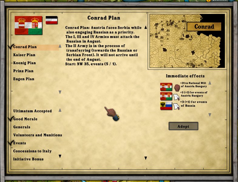 For the same reason as choosing the Schlieffen Plan, I choose the Conrade Plan for A/H. There will be no spectacular beginning of hostilities for the A/H Empire. It is possible they can achieve some good success, but it will most likely be because of good luck. The second Army will arrive in late August opening up some operational options. Too bad by that time the Russian Army will be in full swing.