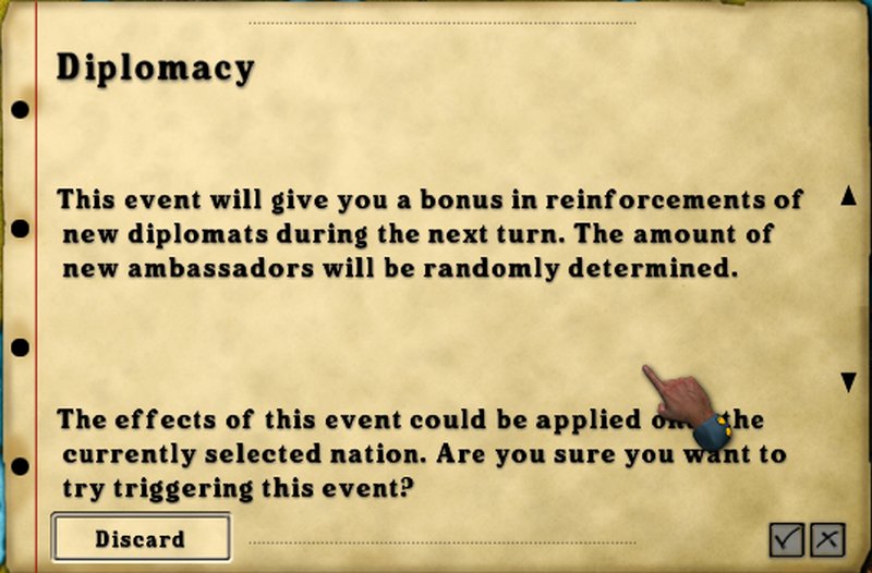 The diplomat assignment dialog has been modified so you can control all of your sides diplomats from the one screen. This is a nice improvement-not only does it shave a couple minutes off the task, but it allowed those of us without machine like memories to better concentrate diplomatic efforts.