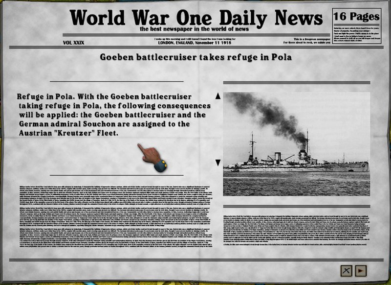 Even though the Ottoman Empire has joined the CP already, the Goeben Task Force made its way into Pola. This means that it will henceforth be part of the A/H Navy. Just how this will work out I'm not sure as I have not had this happen before in an opening I played out. The A/H Navy already has some good ships-this will make for some interesting situations in the Mediterranean. [ATTACH]10877[/ATTACH]