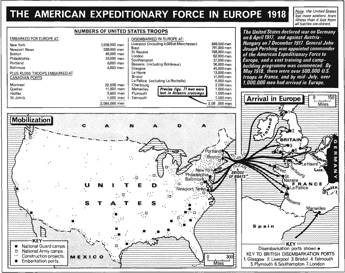 The mobilization effort taxed the American military to the limit and required new organizational strategies and command structures to transport great numbers of troops and supplies quickly and efficiently. The French harbors of Bordeaux, La Pallice, Saint Nazaire and Brest became the entry points into the French railway system which brought the US forces and their supplies to the front. American engineers in France built 82 new ship berths, nearly 1,000 miles of additional standard-gauge tracks and 100,000 miles of telephone and telegraph lines.