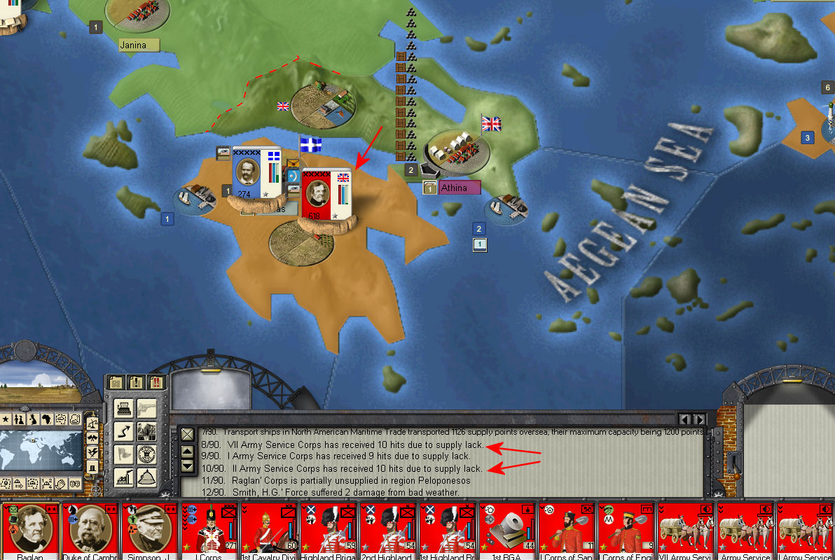 While fighting a war with Greece, I captured Athina. I then waited for my troops to recover and resupply, then they marched southwest in the direction indicated by the red arrow. While waiting for several turns for my generals to pass an activation roll so I could attack, I wasn’t really paying close attention. Suddenly I get the lack of supplies messages shown this turn, but as the image shows, I have plenty of supplies at Athina.
