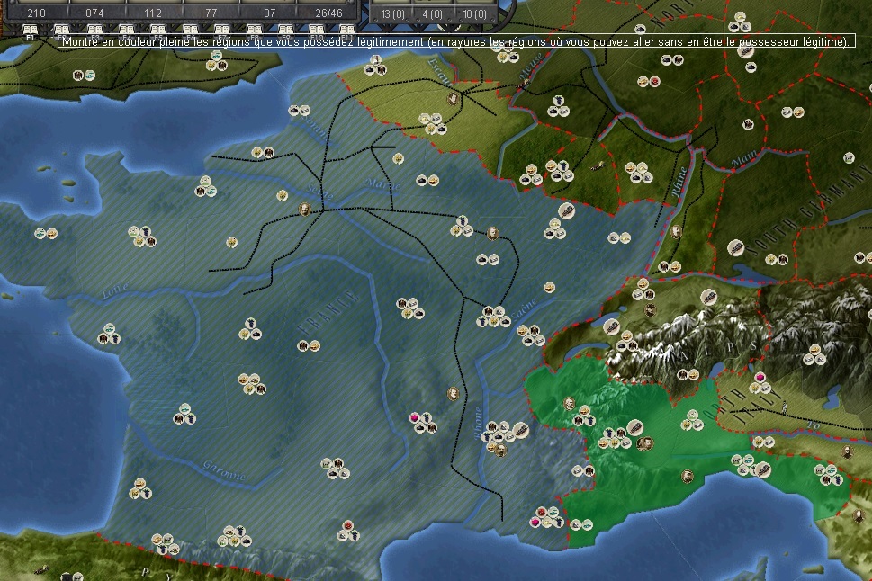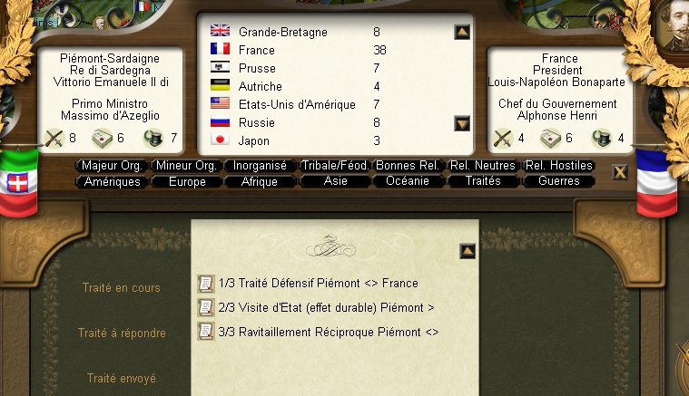 Another curiosity. I'm playing Piemont-Sardaigne but I just received a message which was obviously not intended to me but to France. The message congratulated me for my nearly completed objective of the largest army in the world. The message (looking like a newspaper page) was accompany by a lovely music: La Marseillaise (French Anthem).