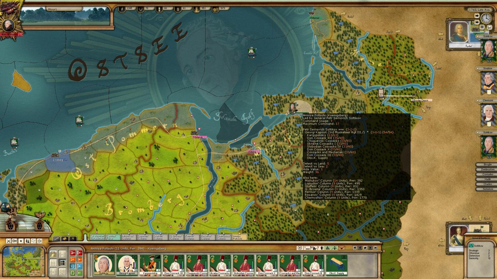 organization(CP) and supply of troops generally are just fine. In other and in many examples in mainland when AI was out of supply while sieging, another force with supply wagon comes just in time. But this example is different. When Austrian force started to march Stettin I was mostly sure they will got out of supply because of the distance of places in case of out of supply.. In other siege of Stettin AI was able to retreat without losing troops but it is risky to siege Stettin like Kolberg , Bremen vs.. Reason is the distance. Even correct desicions made it is very risky to siege those for the ai.