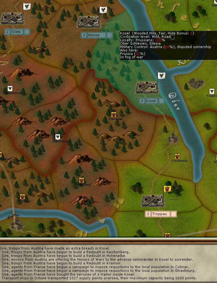 Austrian control in Kosel is 68% so they must be sieging, moreover, there was a message that Austrians made an extra breach in Kosel.