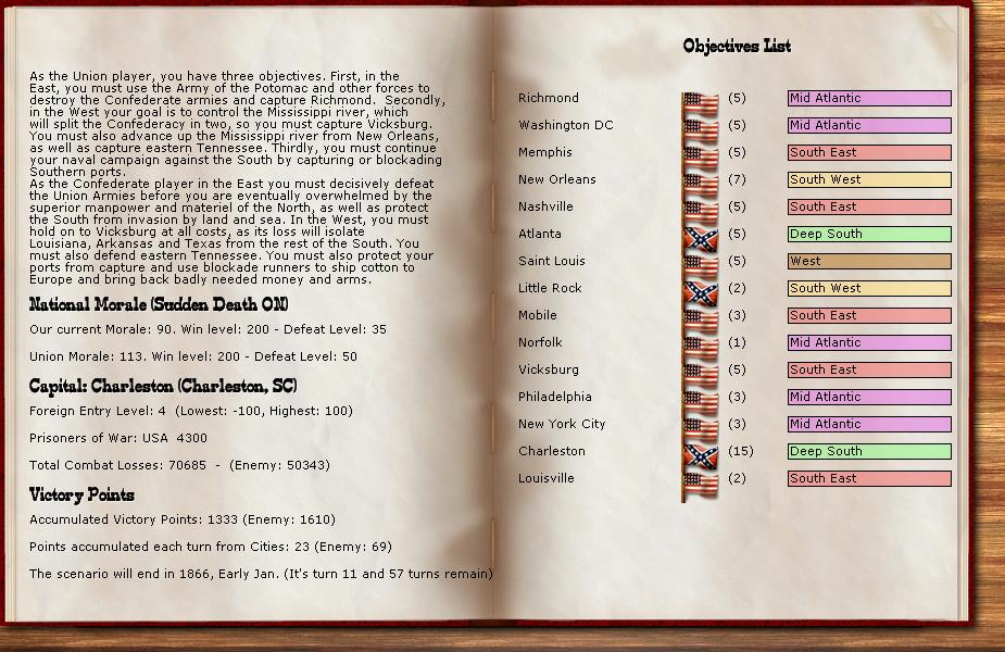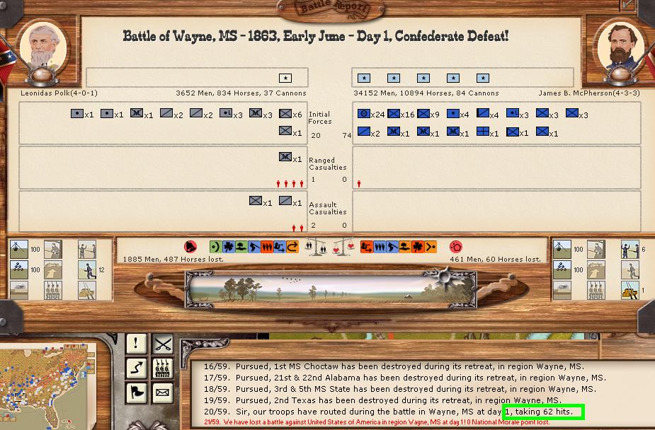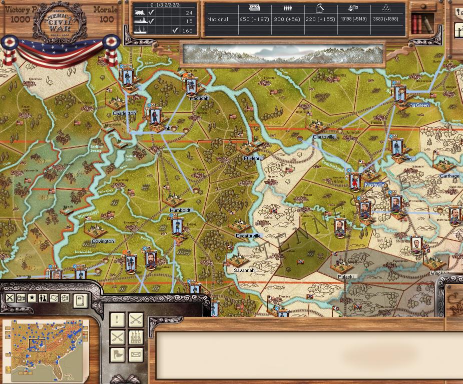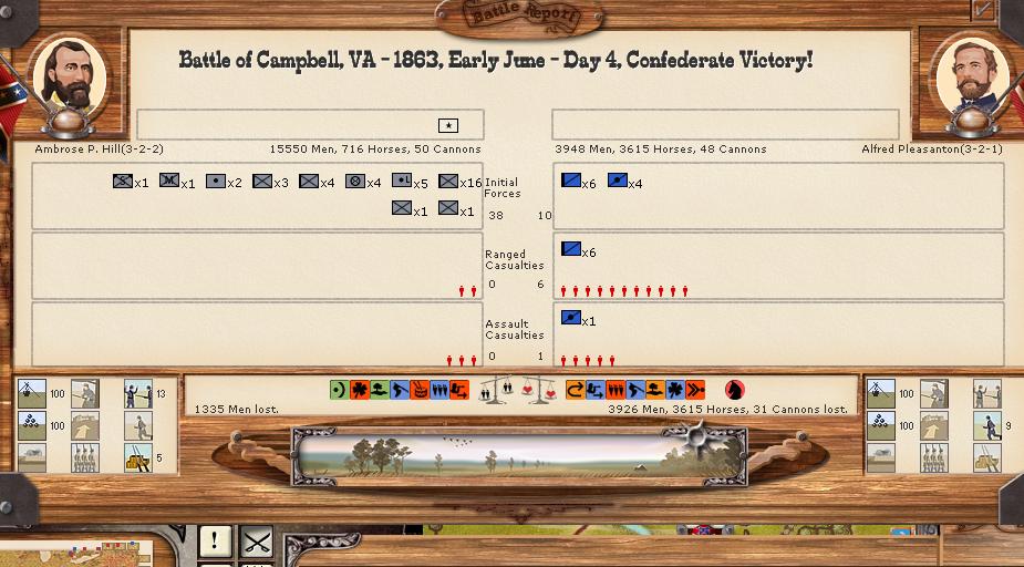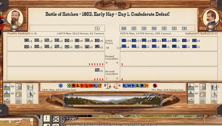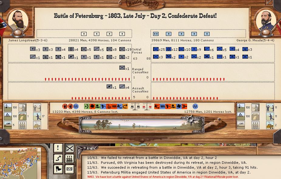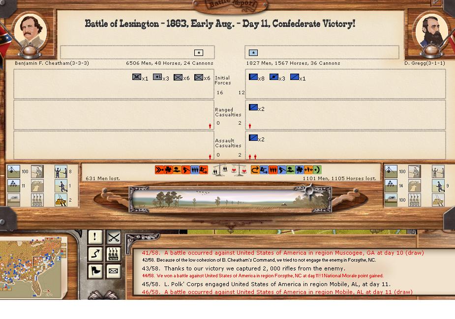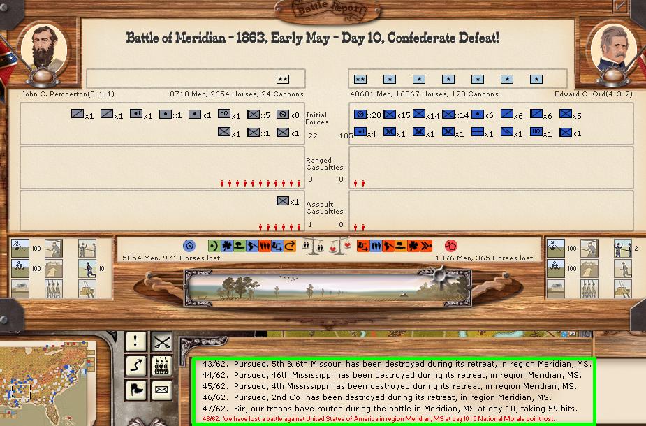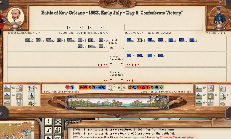 There were 11 minor battles, and 1 moderate battle. There was 1 minor naval engagement. Vicksburg was able to hit union shipping in the Mississippi for 100 hits, while suffering only 5 in return. Savannah was able to score 43 bombardment hits, and receive only 5 in return.