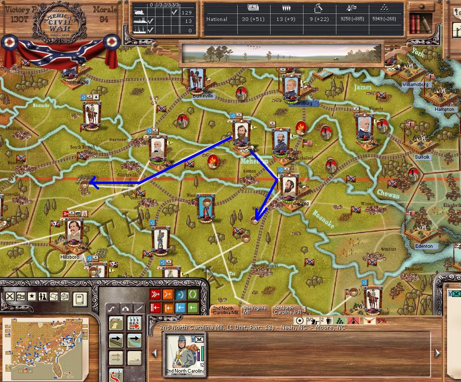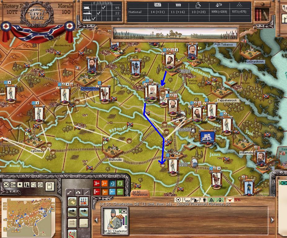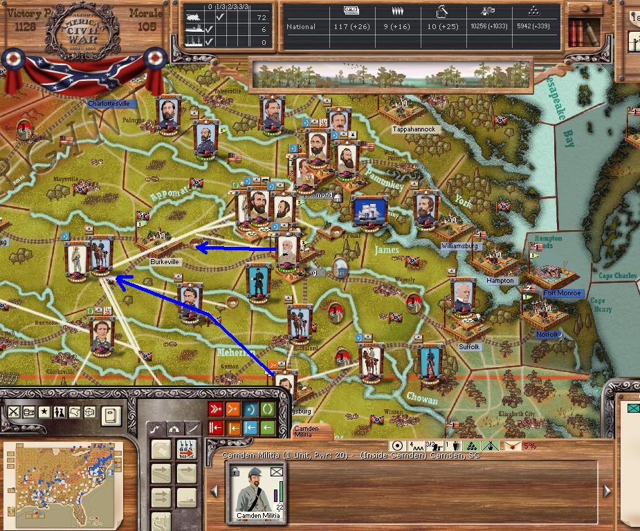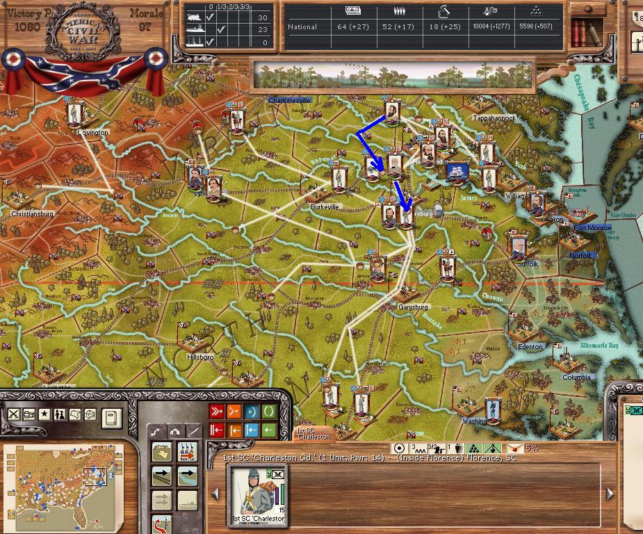 In Virginia, we hold Petersburg and Lee/Jackson are at Garysburg. Petersburg's depot will be blown this turn.