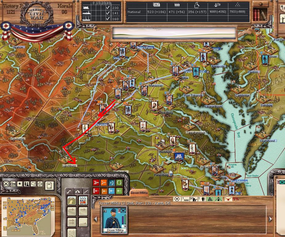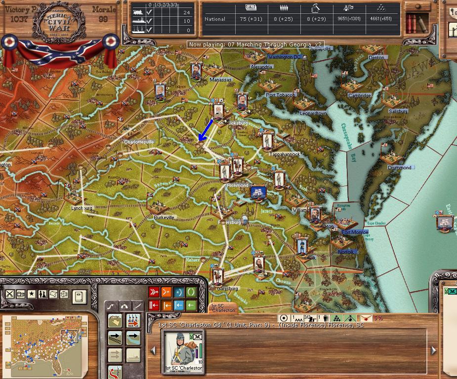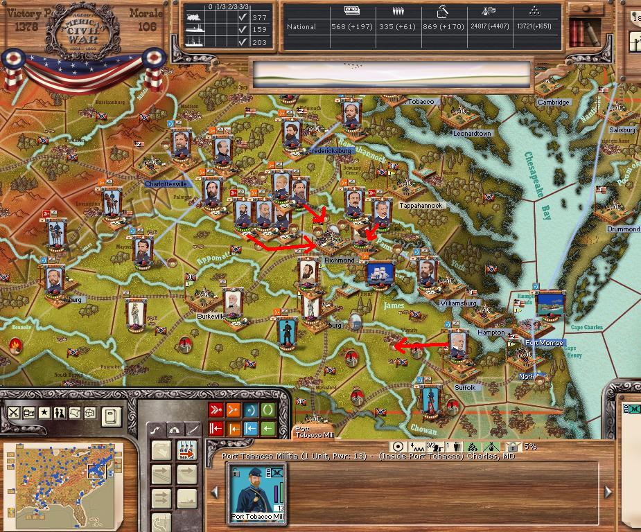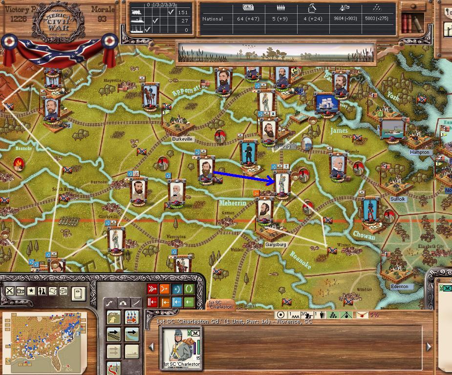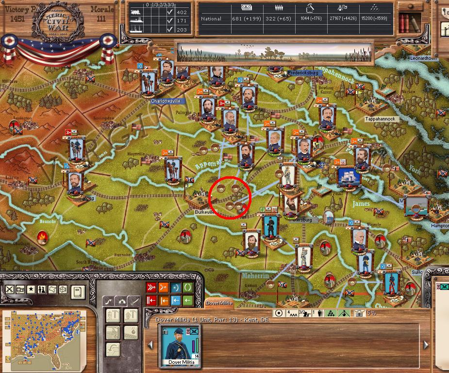 In Virginia, we hold Petersburg and Lee/Jackson are at Garysburg. Petersburg's depot will be blown this turn.