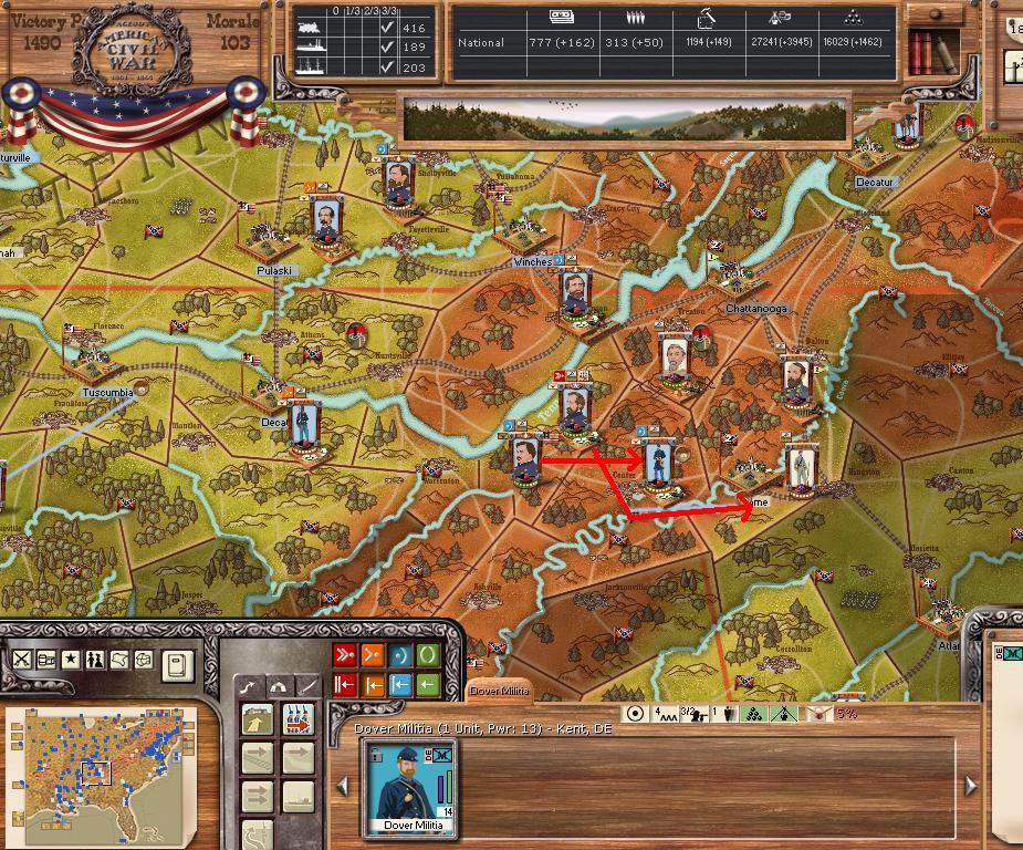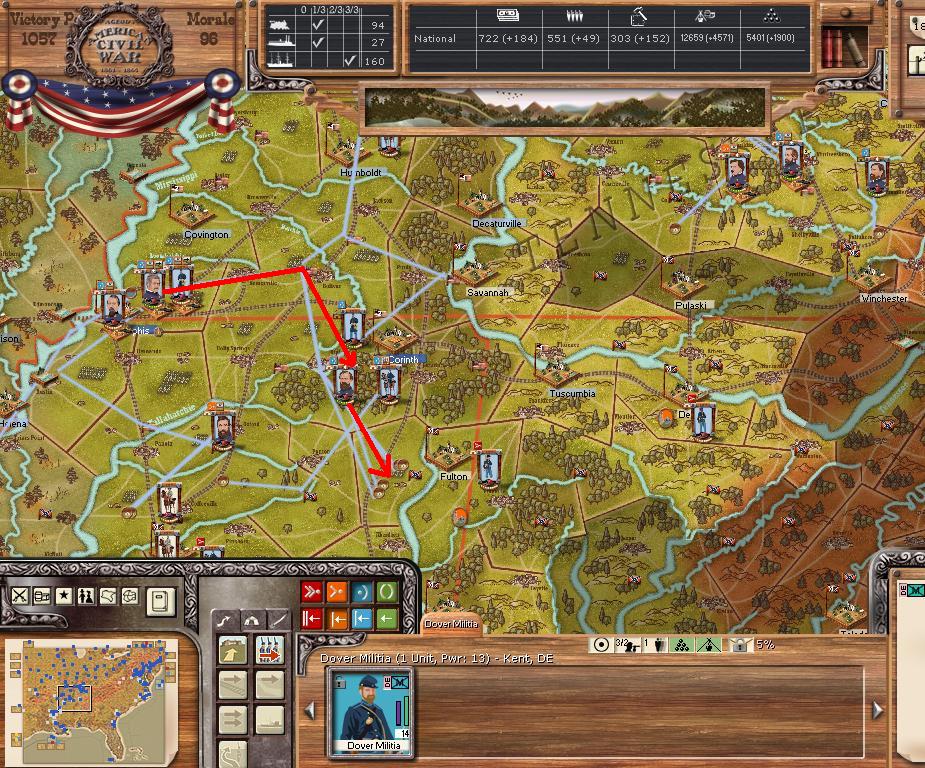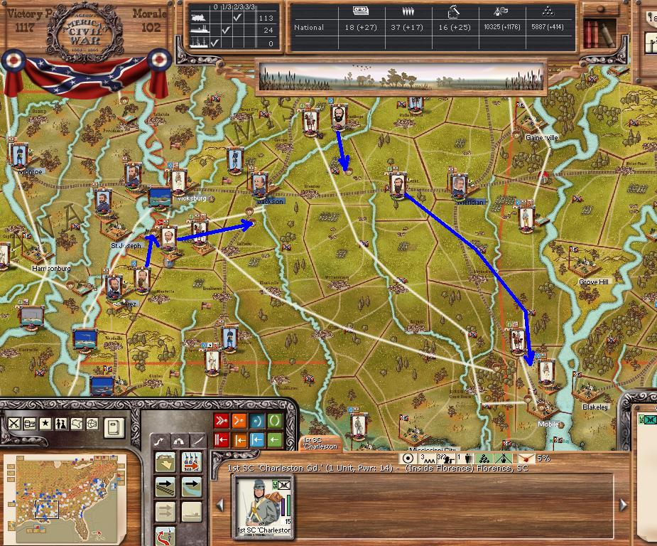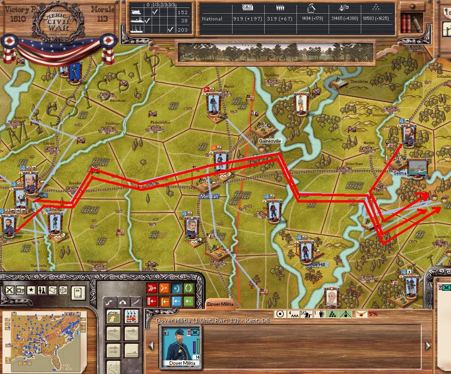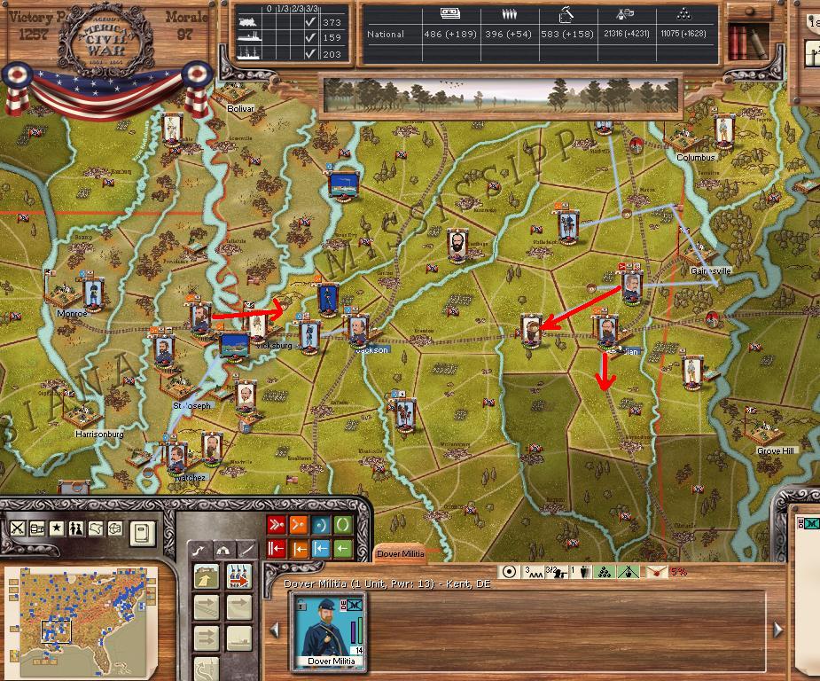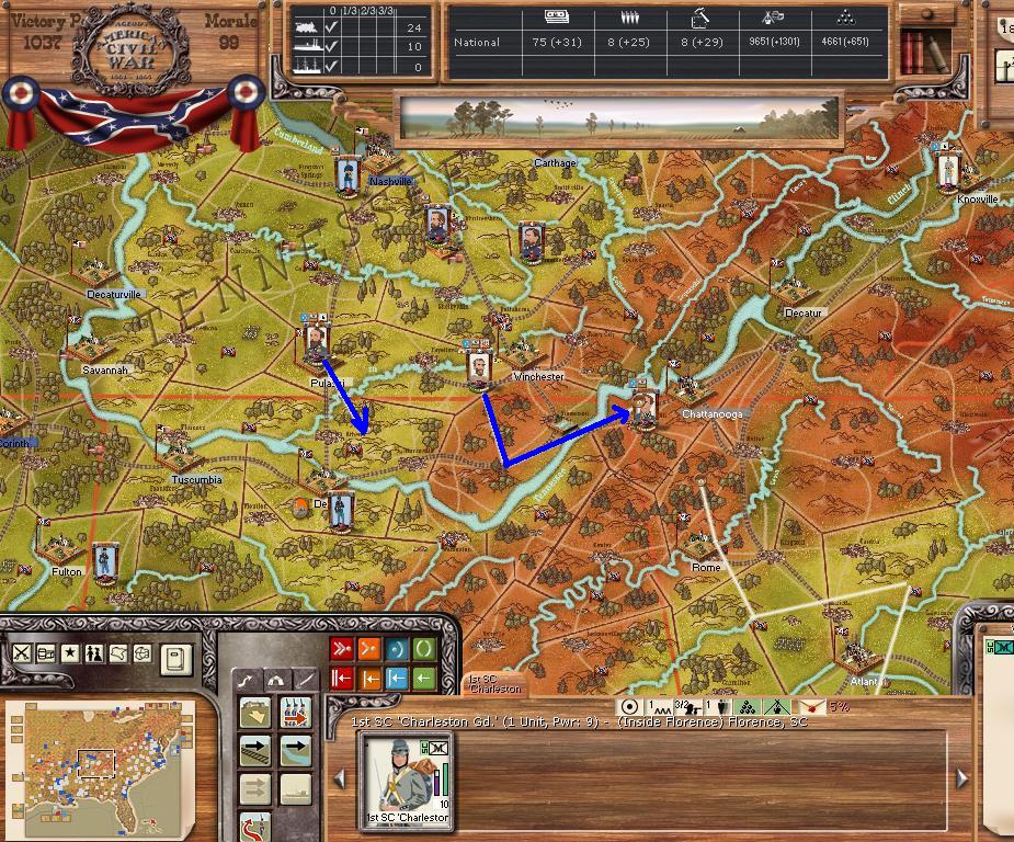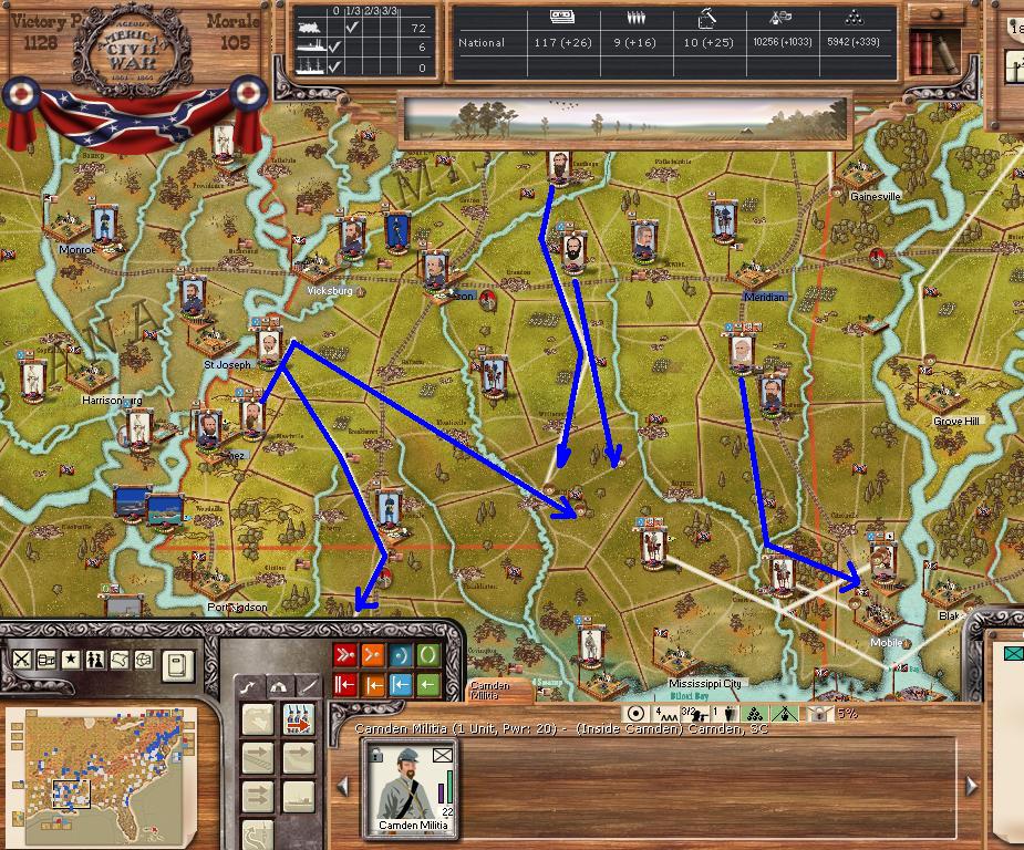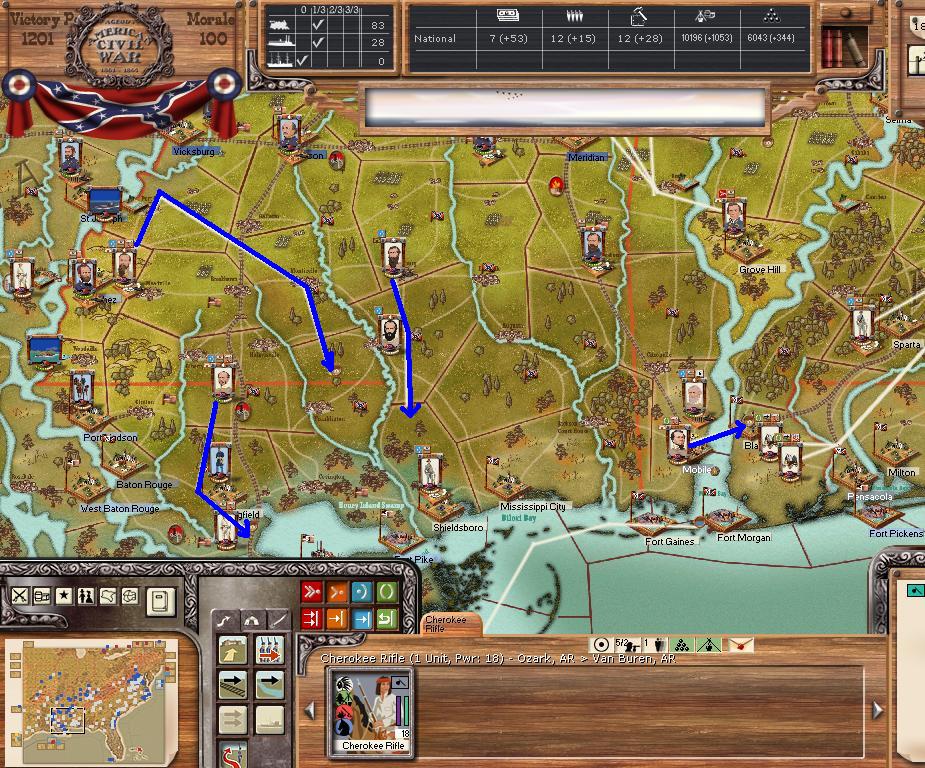 In the east he is redeploying for defense of the coast. AOM is deploying around Vicksburg on the east side of the river. AOT is going to Winchester to defend Chattanooga.
