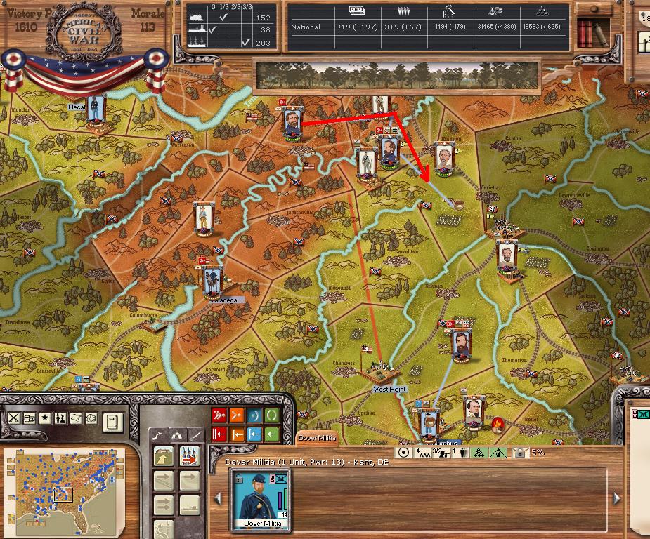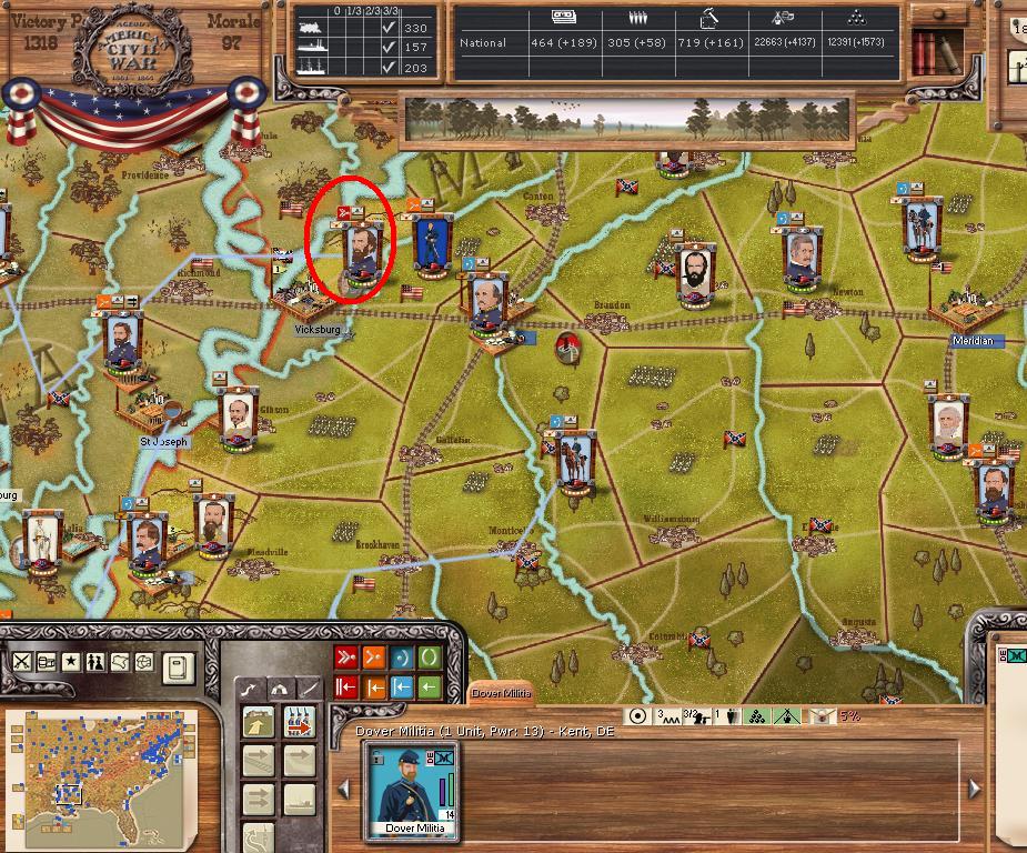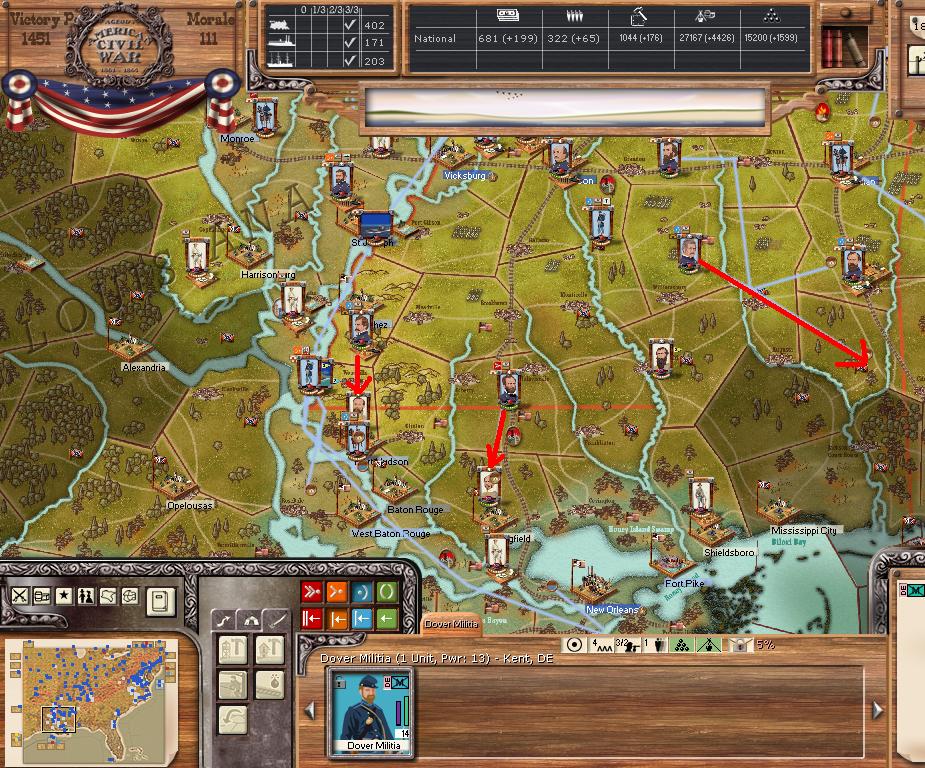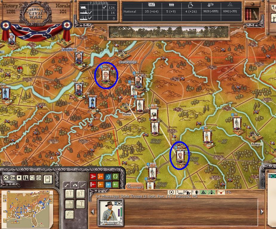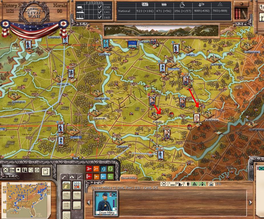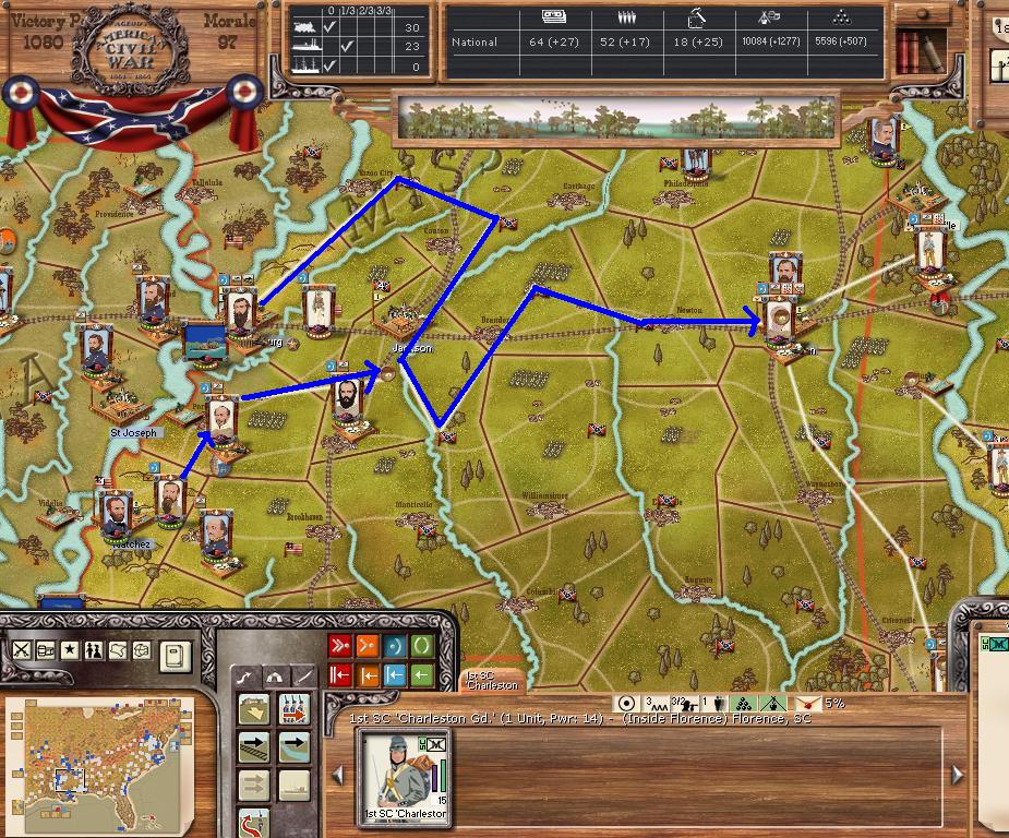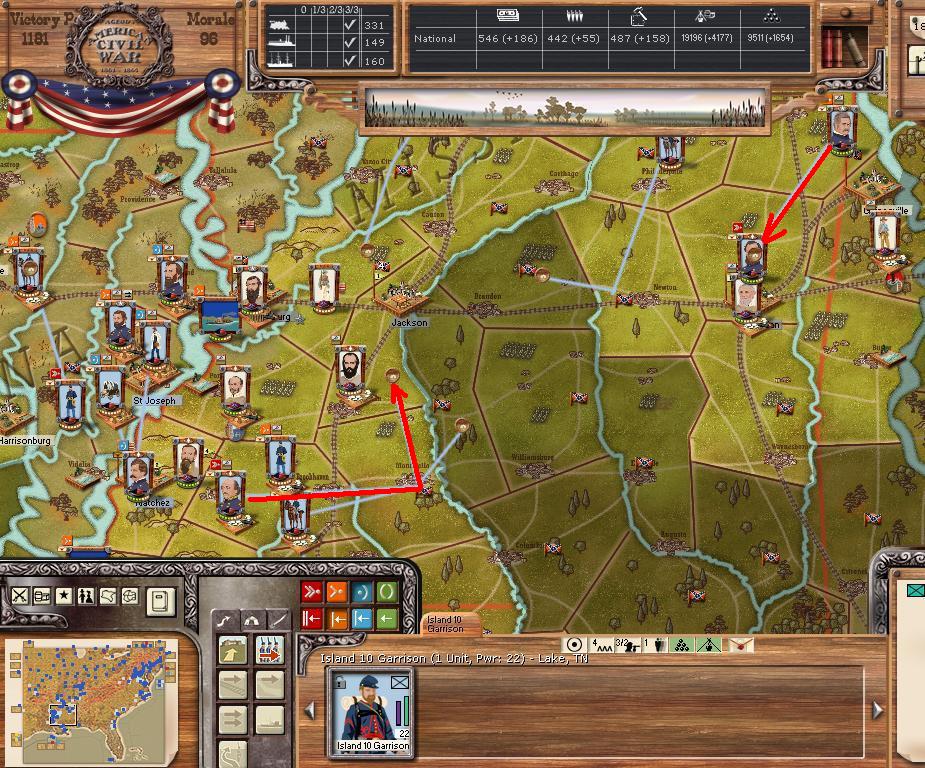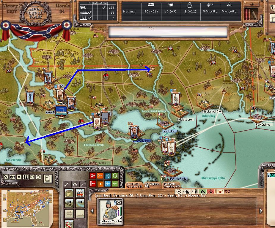In the east he is redeploying for defense of the coast. AOM is deploying around Vicksburg on the east side of the river. AOT is going to Winchester to defend Chattanooga.