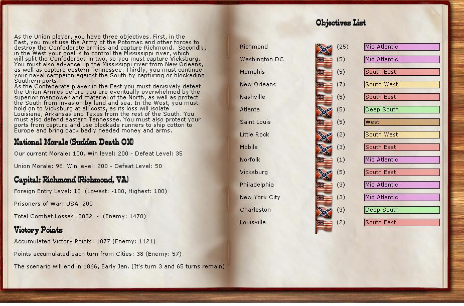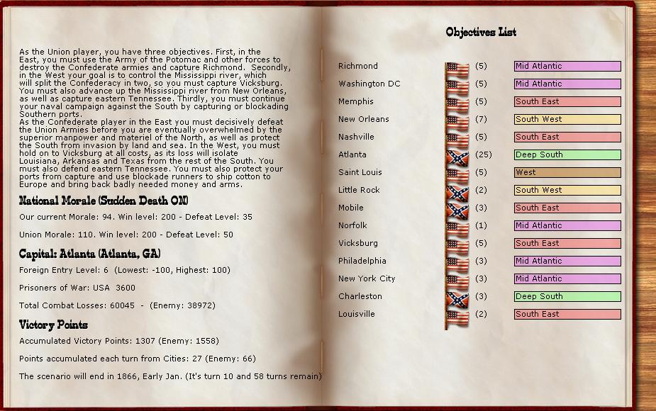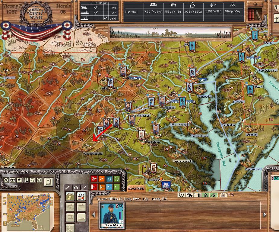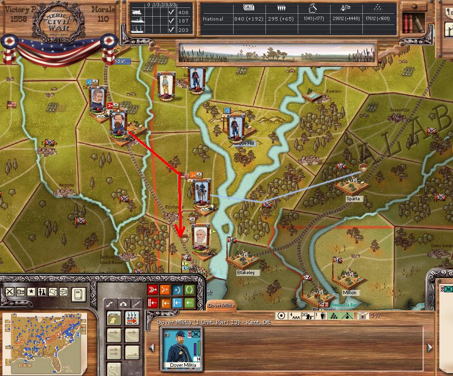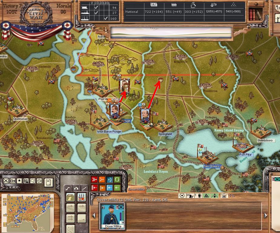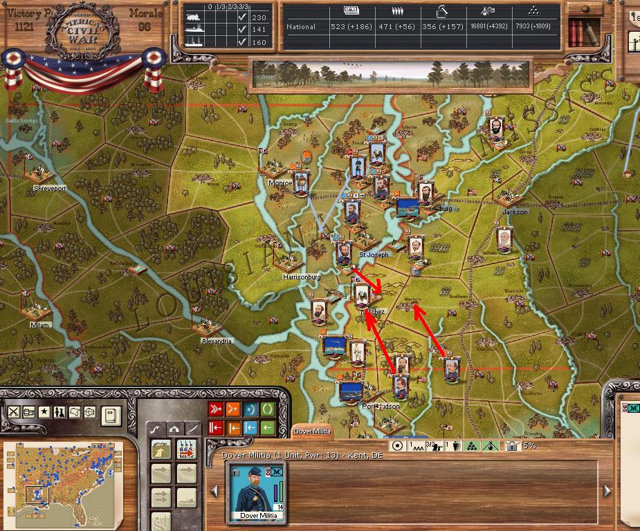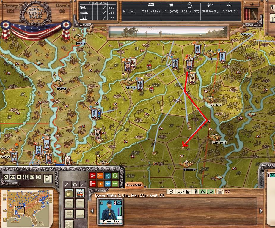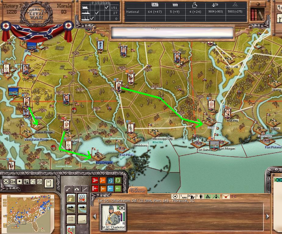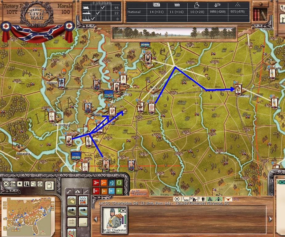 In the east he is redeploying for defense of the coast. AOM is deploying around Vicksburg on the east side of the river. AOT is going to Winchester to defend Chattanooga.