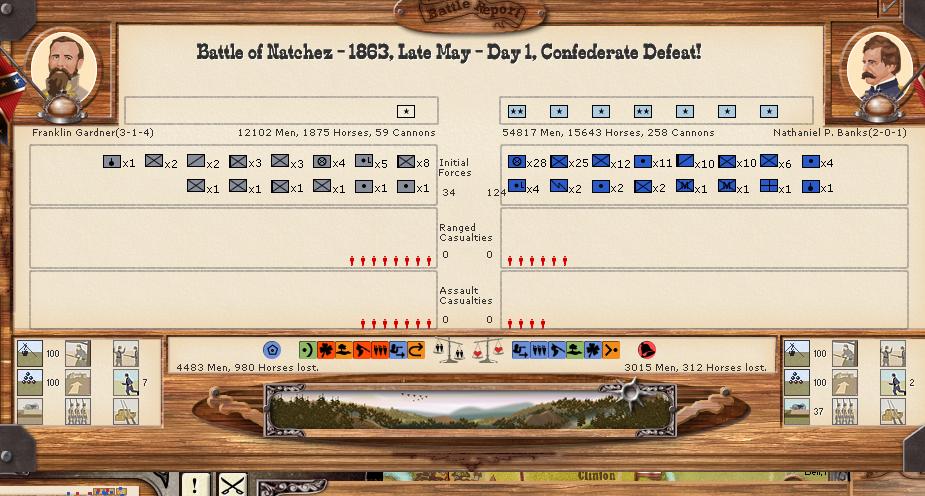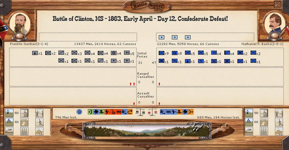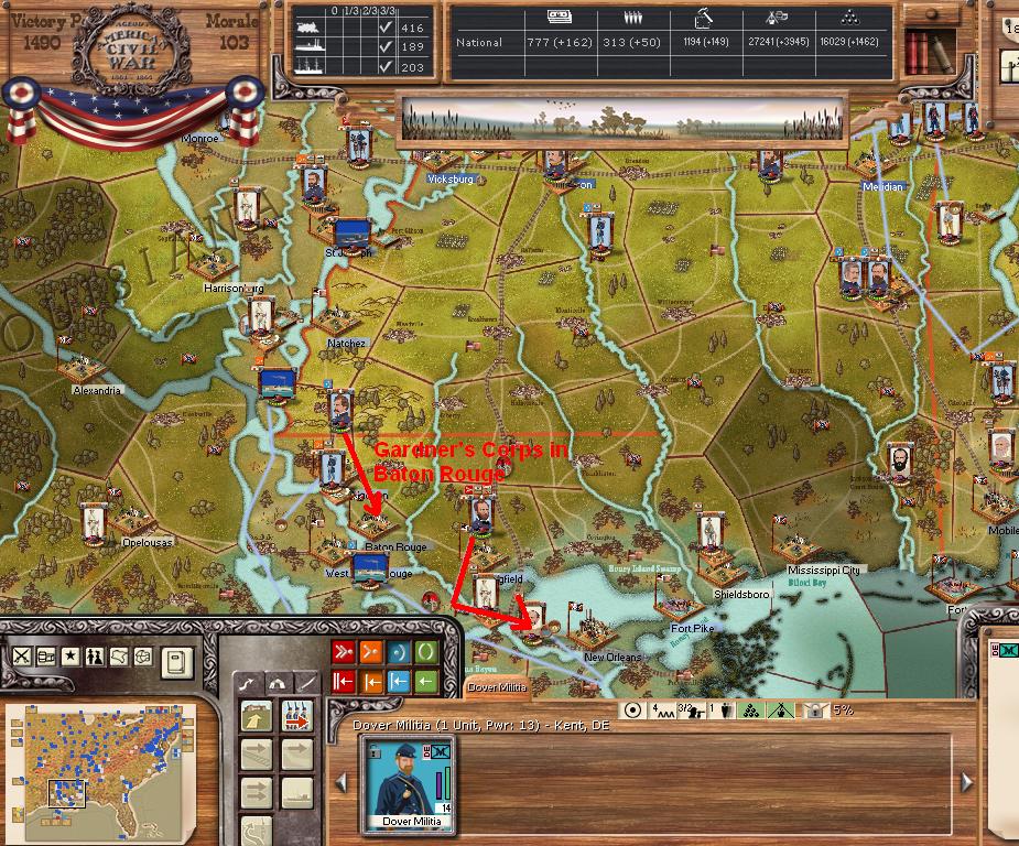 Gardiner is almost done, his battered divs. will retire into Baton Rouge and see what happens while JJ holds at all costs at New Orleans. Polk will gather the few regs. he has but Mobile is lost as Ord/McClernand are now in supply around Meridian.