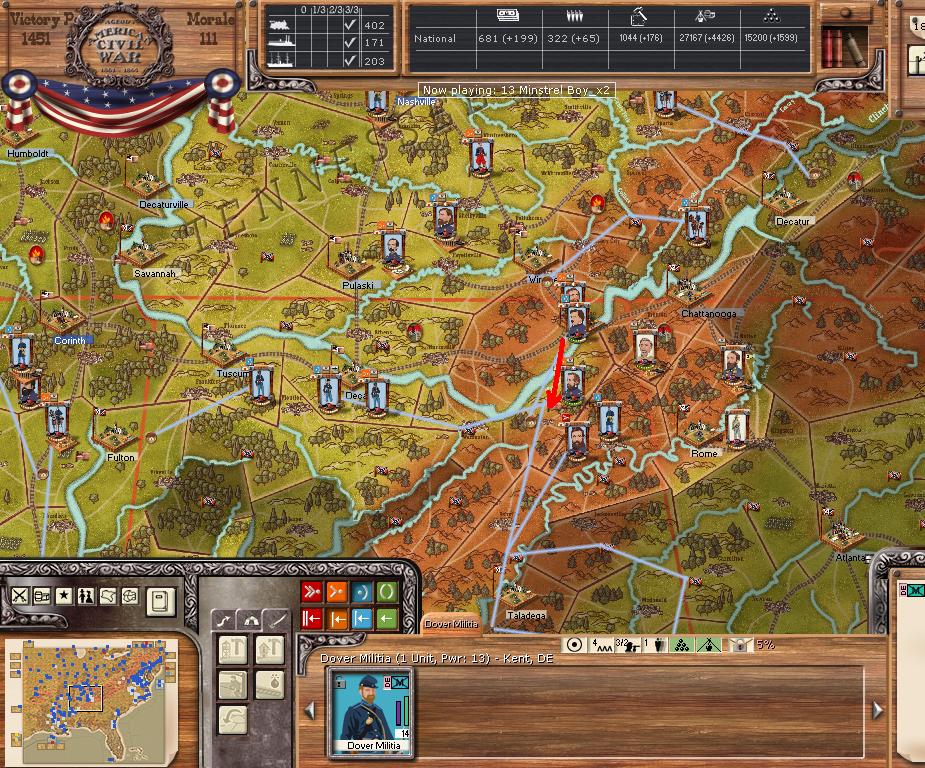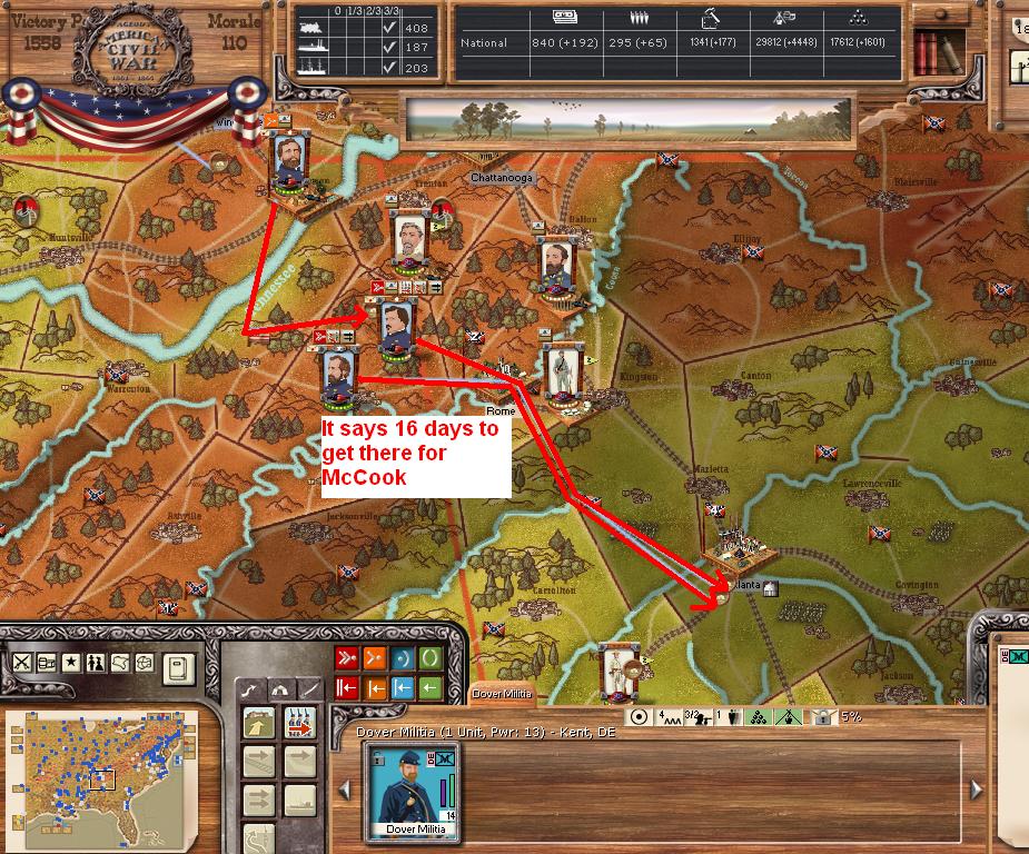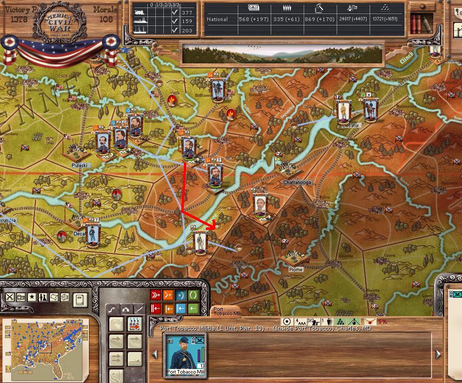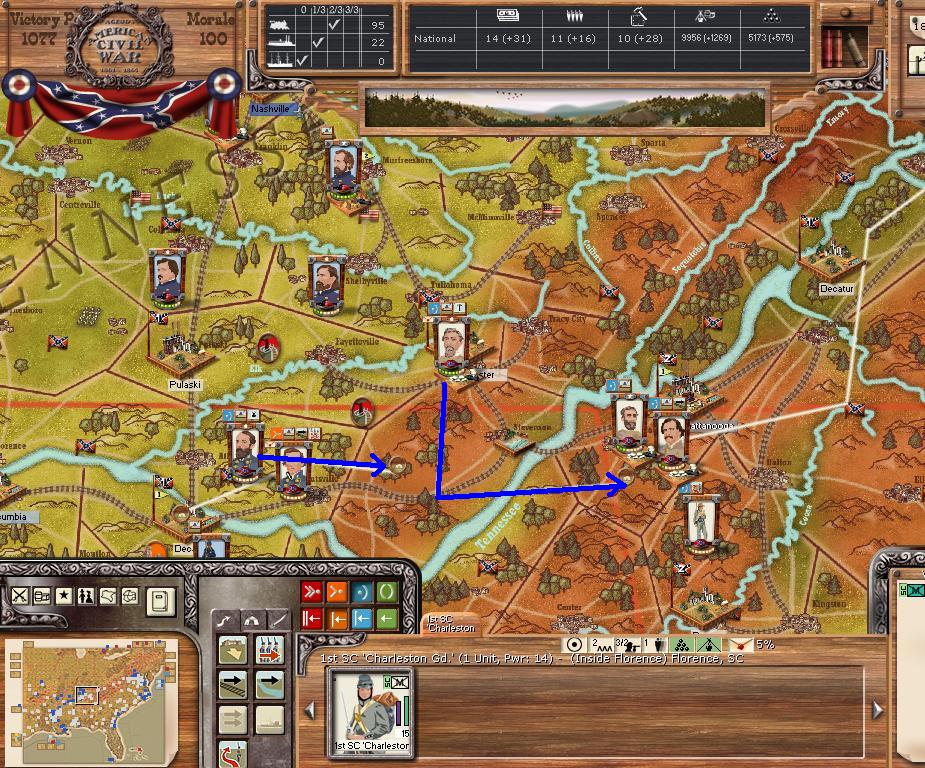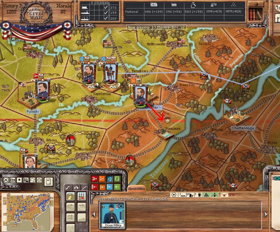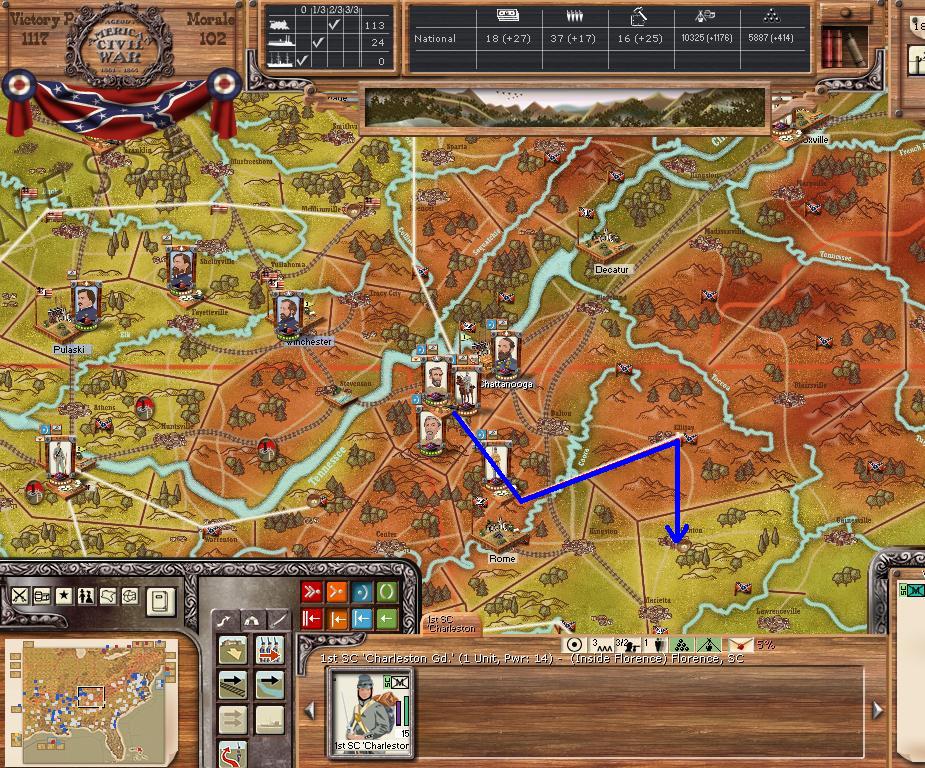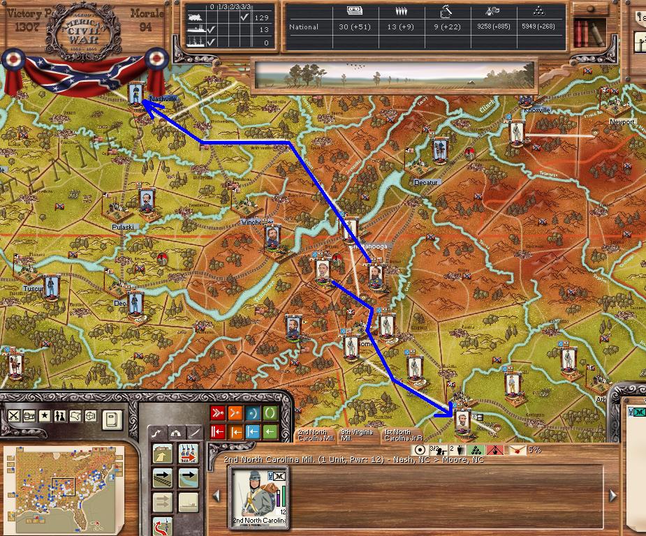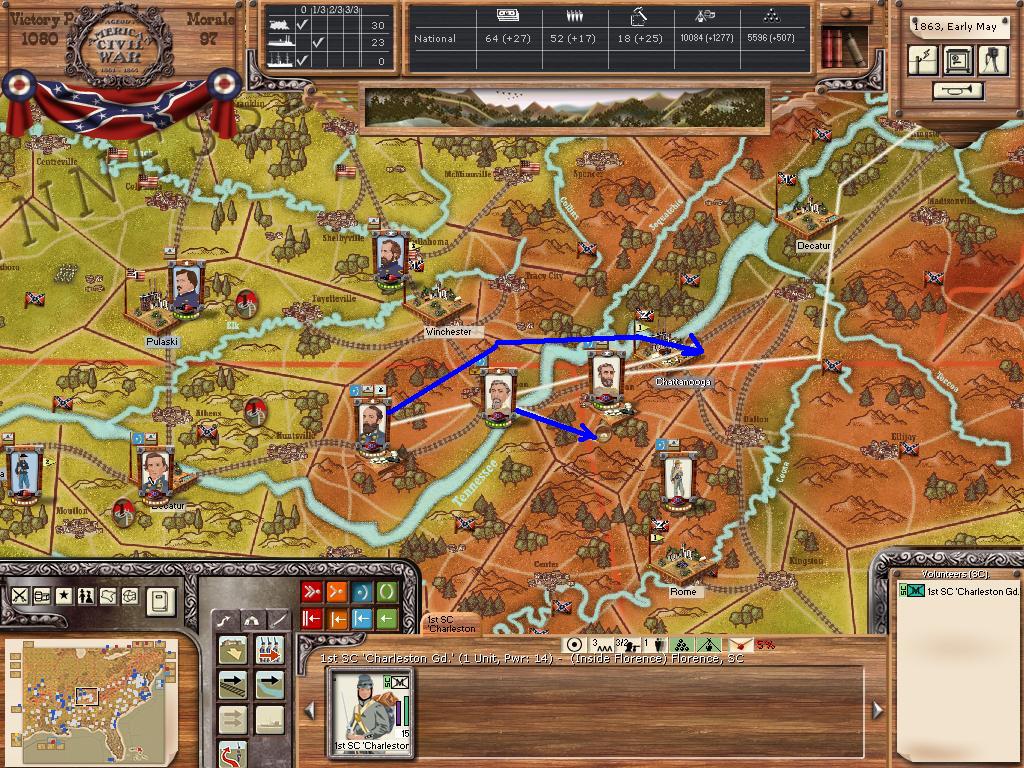Hardee will leave Chattanooga, it appears Rosecrans is planning to cutoff our Corps now that his depot is built at the harbour just across the river. We send Wheeler northward against Nashville, to hopefully cutoff Rosecrans supply, we have waited for this move, planned it for this exact moment and our plotted march will get us at Nashville on day15, with luck we will engage and take the town/depot while Rosecrans/Thomas marches southward after Hardee.