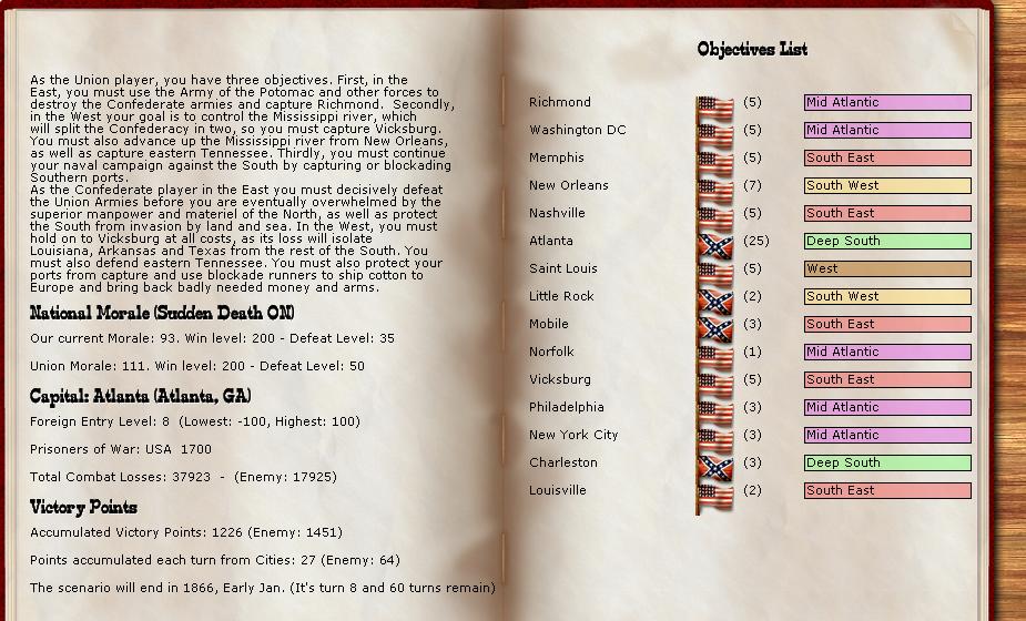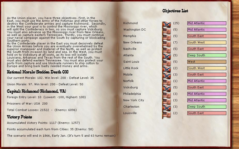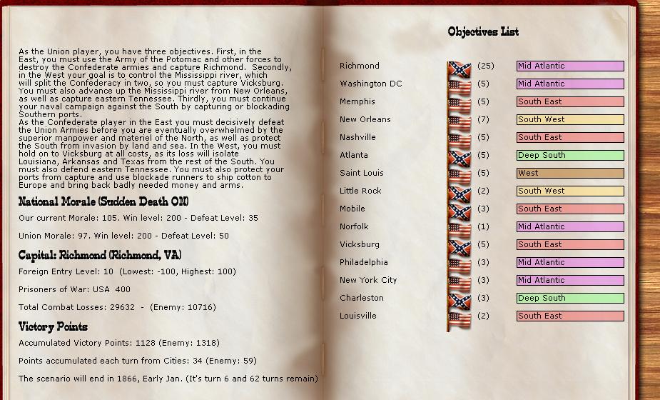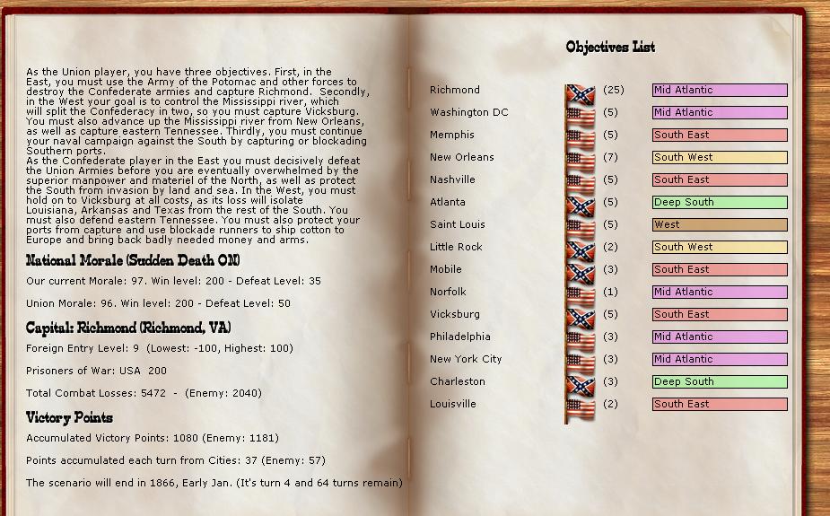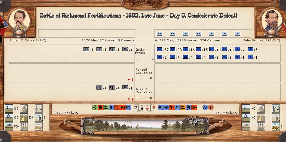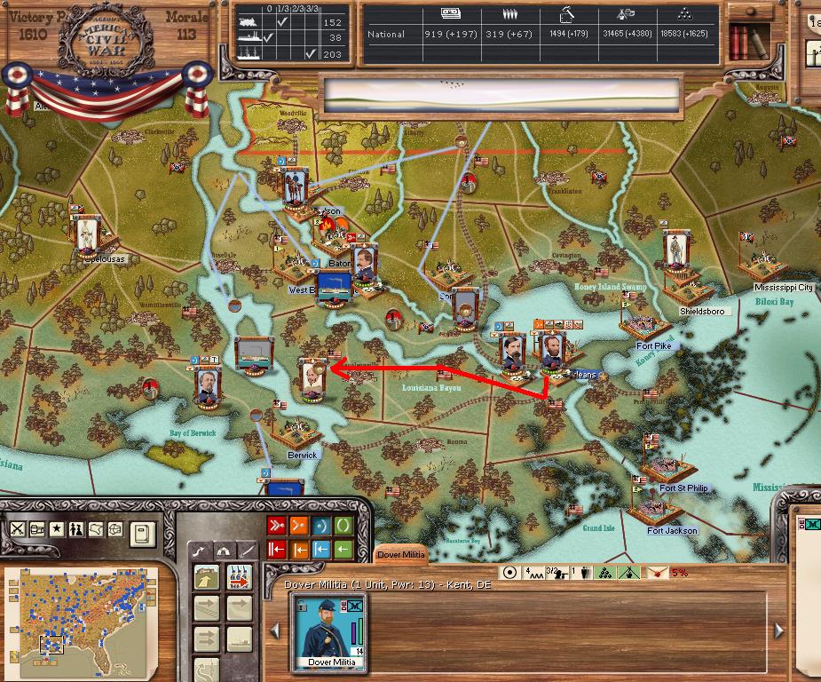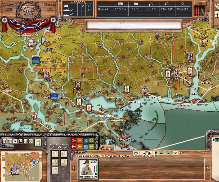 As the rebels, which I never play except in these tourneys, I plan to defend in depth. Burn, slash and delay the Union. I expect to retreat often. I build lots of militia and cheap 6,12lbrs. to aid in defending in depth, have the militia build up trenches and hold my rear areas against the US Cavalry which the US has in ample supply. I do move to defend the Union crossing the Miss against Vicksburgh as I know Grant cant do much from the West side by sailing my tiny Miss fleet back and forth between Baton Rouge and Vicksburg.