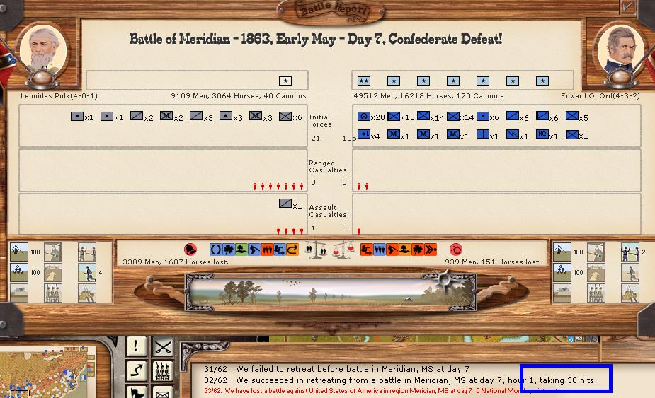 Gardiner is beseiged, but MC remains so I break seige on defensive evade commands, his bleeding troops in constant retreats and will attempt to retreat eastward, while AJohnstone begins his death march northward from New Orleans. If Sherman moves against AJ, perhaps Gardiner will slip thru and be able to escape with his battered corps.