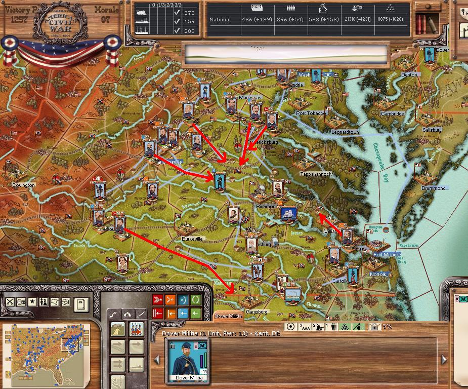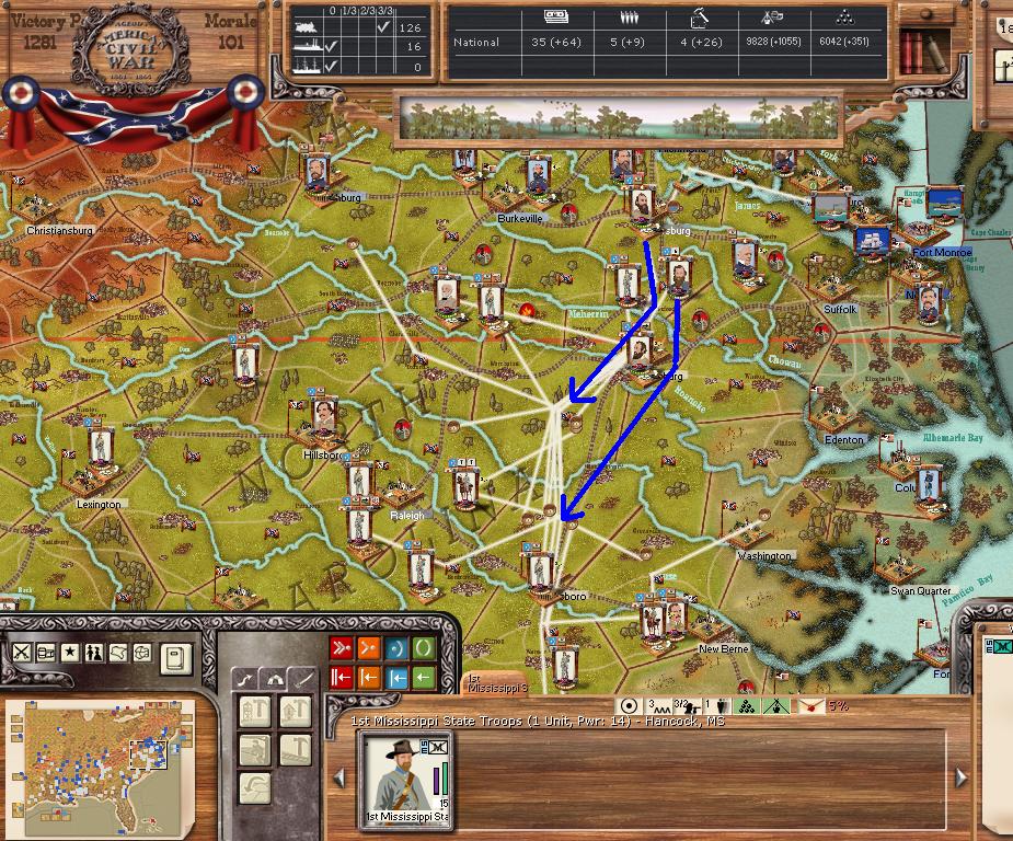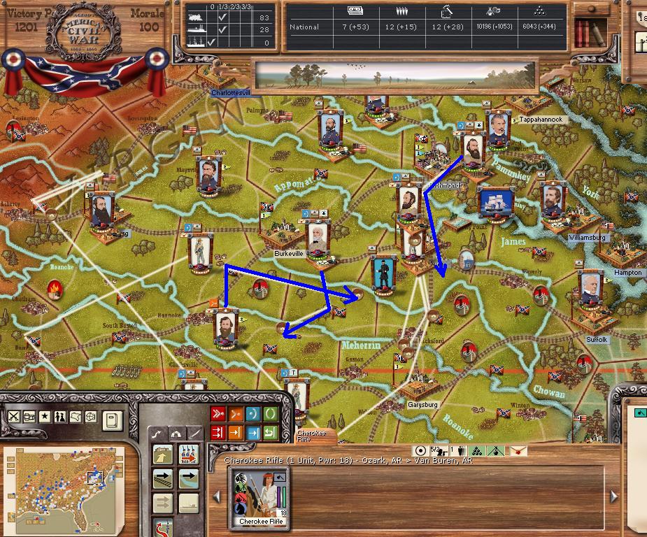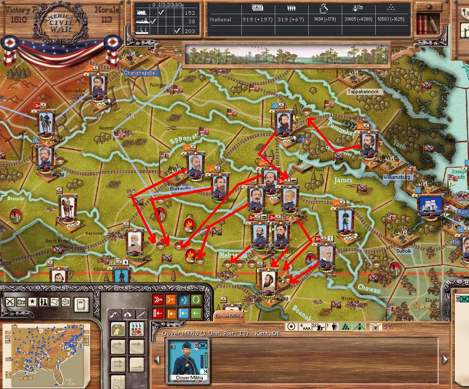 AOP - attempt to flank the ANV by moving to Lynchburg, VA. Norfolk units move west towards Petersburg. AOC move towards Winchester, ultimate goal of Chattanooga. AOT - gather at Natchez, Sherman will have to cross the Mississippi river. Mississippi command towards Meridan MS.