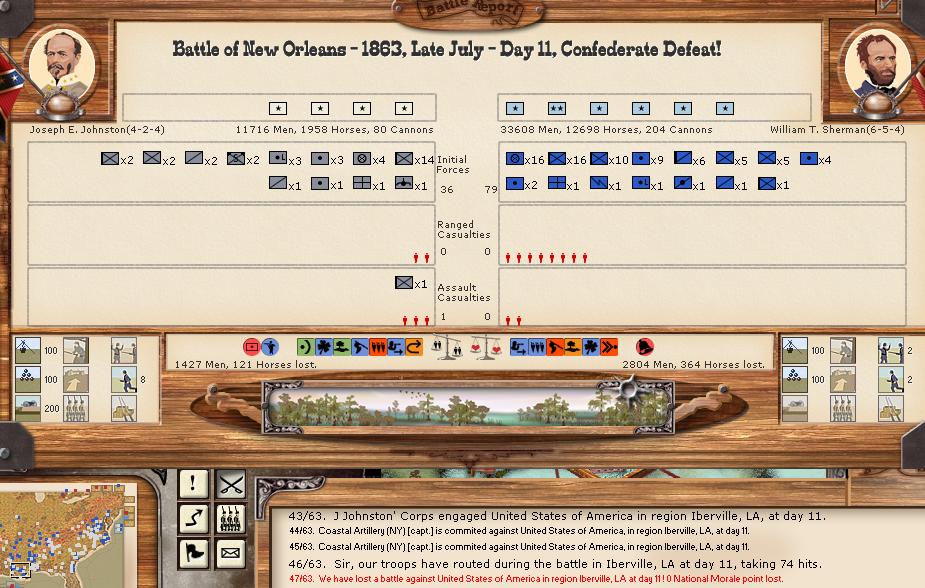 JJ puts in a poor effort and loses New Orleans pretty easily, but our forces were extremely fatigued and Sherman outgunned us (a given). Even though our forces were outnumbered 3-1 they mostly retreated due to their poor cohesion.