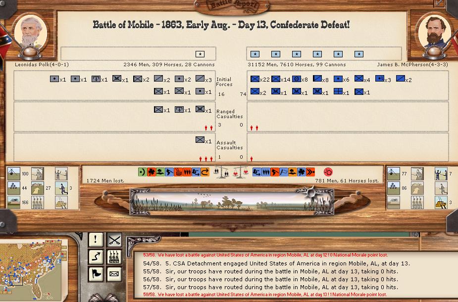 Polk reorgs some weak conscript regiments at Mobile but we only have a token force against the oncoming Union forces.