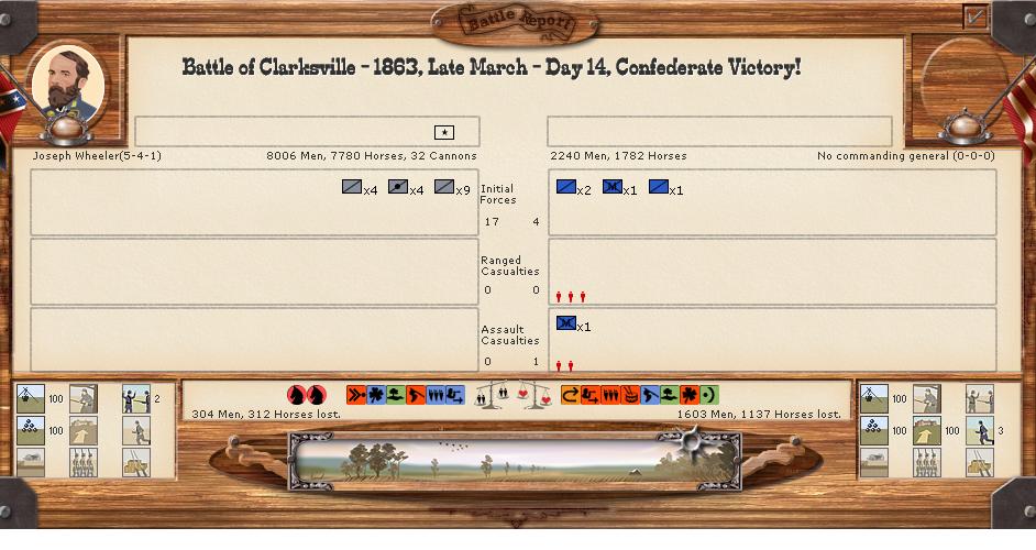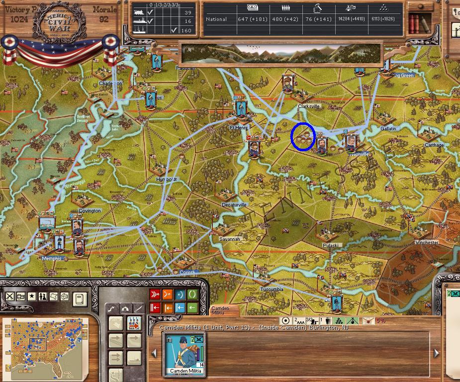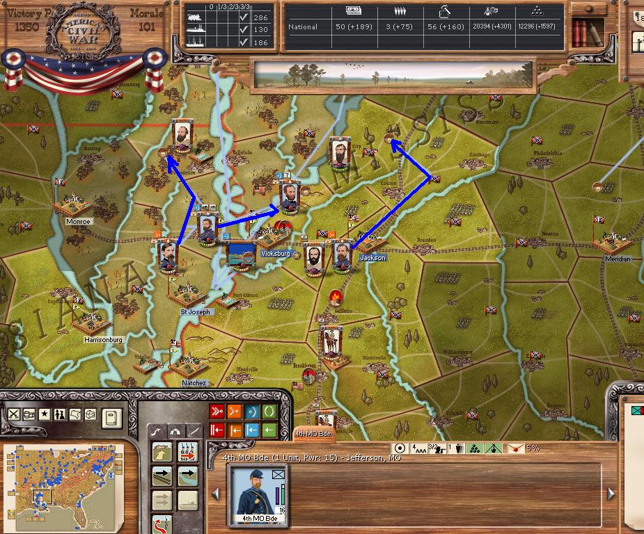 At Nashville, my army under Ord's command his growing his forces too, and I hope to have about 15 divisions in a few turns, then I will attack Chattanooga to Atlanta. The forces around Memphis has formed the right wing Corps of this army, under Cook's command, stationed now at Corinth, defending the pass to Memphis, but it will take the offensive posture when Ord´s army attacks Chattanooga. This Cook´s Corps is really a joker, because ha can support the Ord advance to the south or to be placed under Grant command and support Grant´s army around Vicksburg. He will be used depending on how the rebel forces will be positioned.