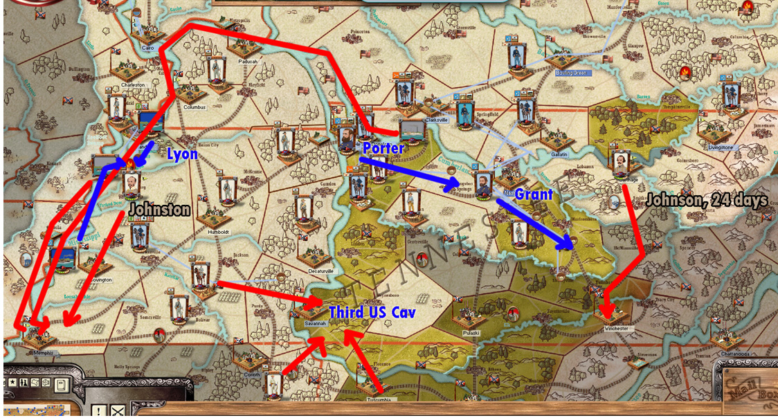 In Tennessee, Third US Cav is trapped unable to move by land! With only eight power things seem very bleak indeed. We may be witnessing the destruction of our brave profile element.