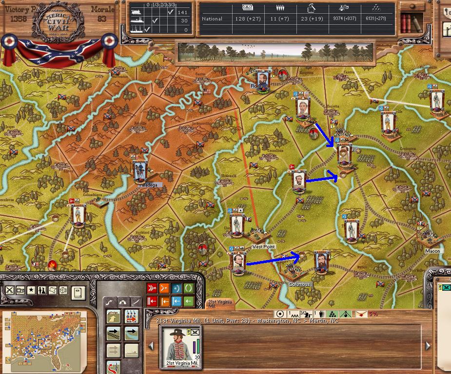 AOP attempts to push through the ANV (3 corps + HQ). AOC attacks Atlanta with 2 corps and the HQ. AOT moves towards Montgomery, with Sherman chasing Johnston.
