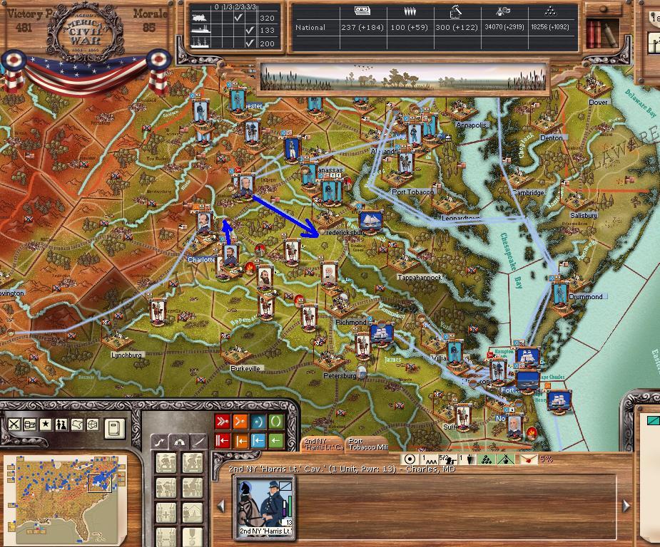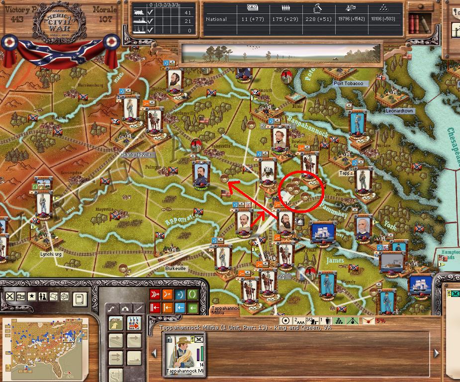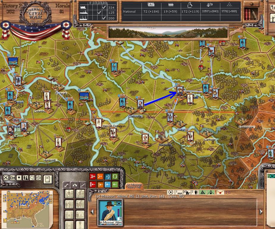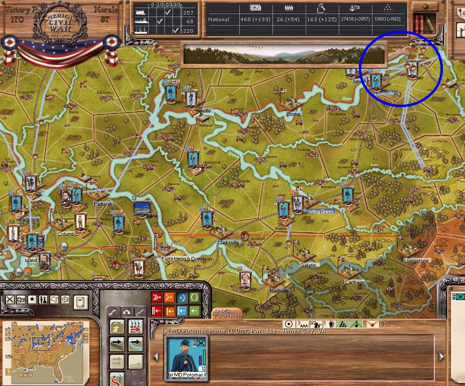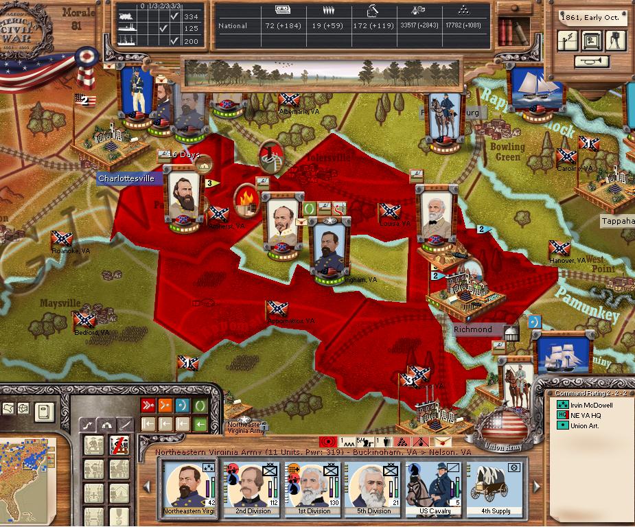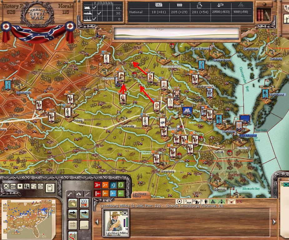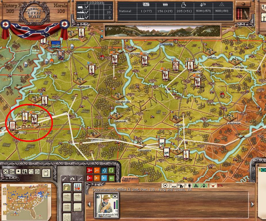 Orders - Johnston & McCulloch to Culpepper, Major reinforcement of the AOP at Richmond. In the west, troops are gathering at Nashville, and Memphis. Price gathers his command at Ft. Smith AR with the addition of many troops. Manstein is going heavily into independent artillery units (purchasing 20 units in the last 2 turns).