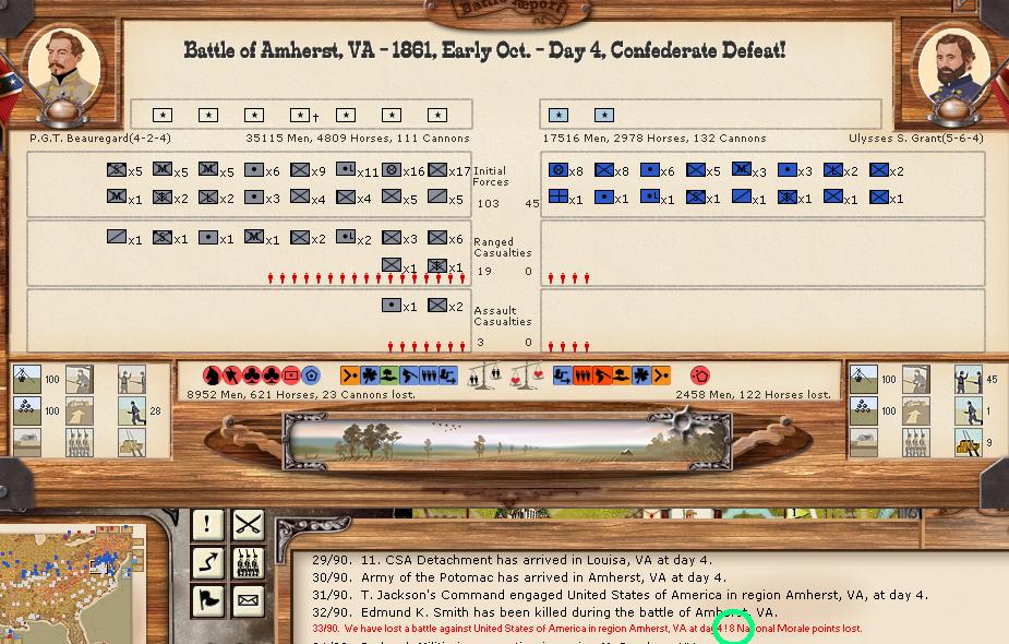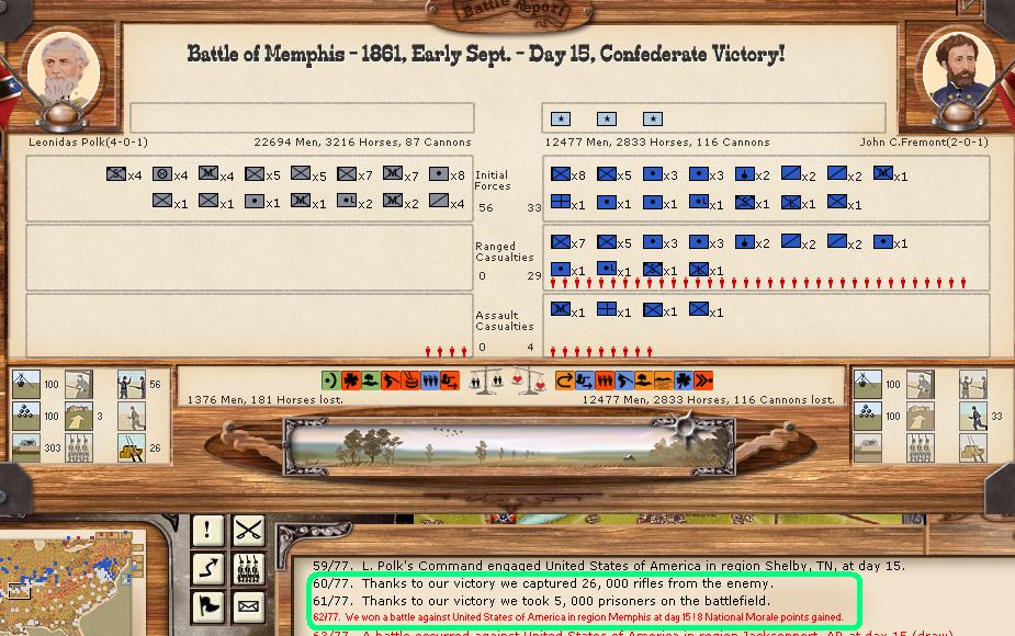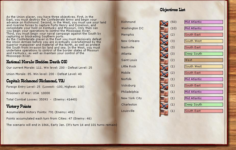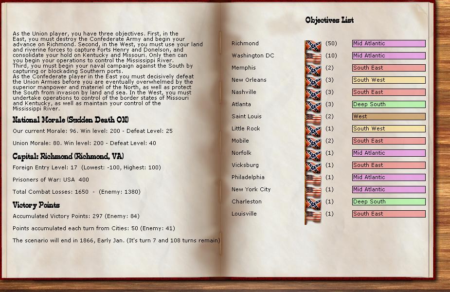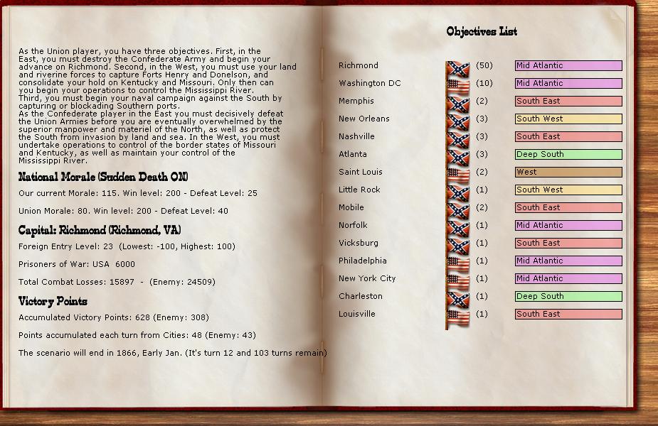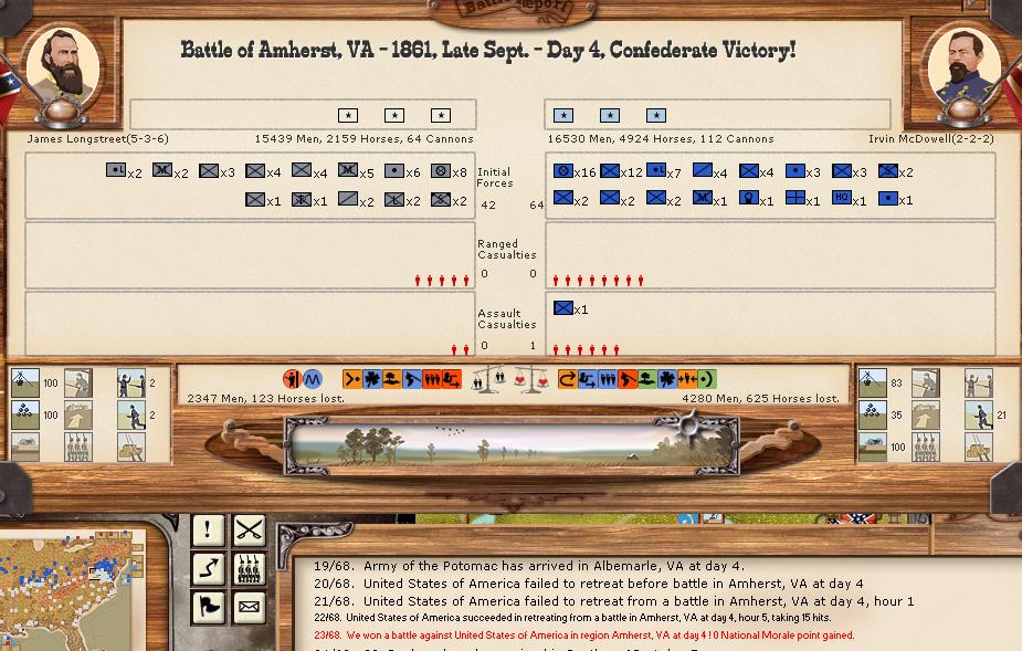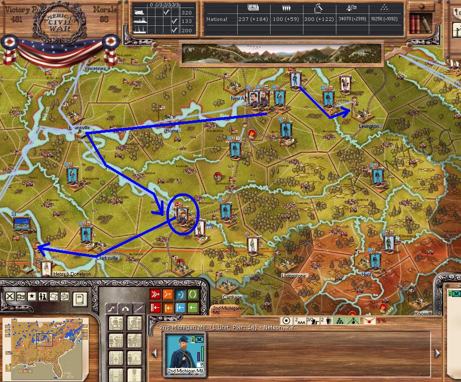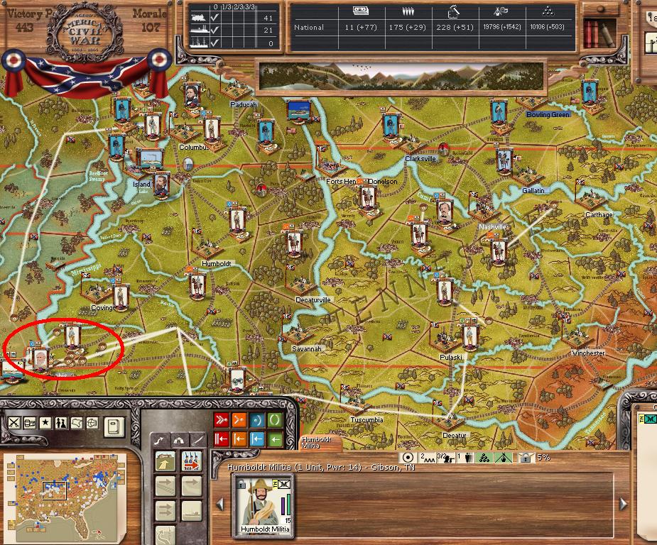 Orders - Johnston & McCulloch to Culpepper, Major reinforcement of the AOP at Richmond. In the west, troops are gathering at Nashville, and Memphis. Price gathers his command at Ft. Smith AR with the addition of many troops. Manstein is going heavily into independent artillery units (purchasing 20 units in the last 2 turns).