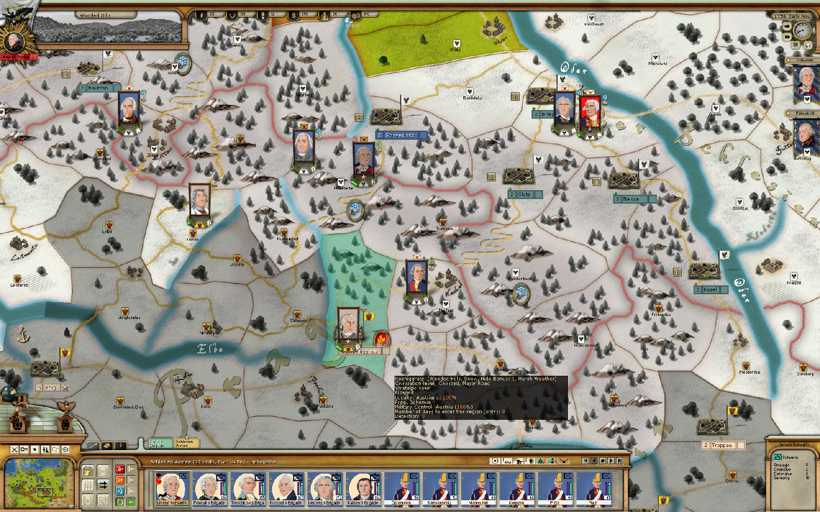 What is really strange you can see on the second screenshot, a cavalry unit in Zwickau should move to Chemnitz and from there south but see how the path is made, it circles around the mountains and prohibits the direct patch between Chemnitz & Freiberg, but not only this it also blocks the direct route between Aue & Freiberg and moves from Aue back to Marienberg and then on to Freiberg.