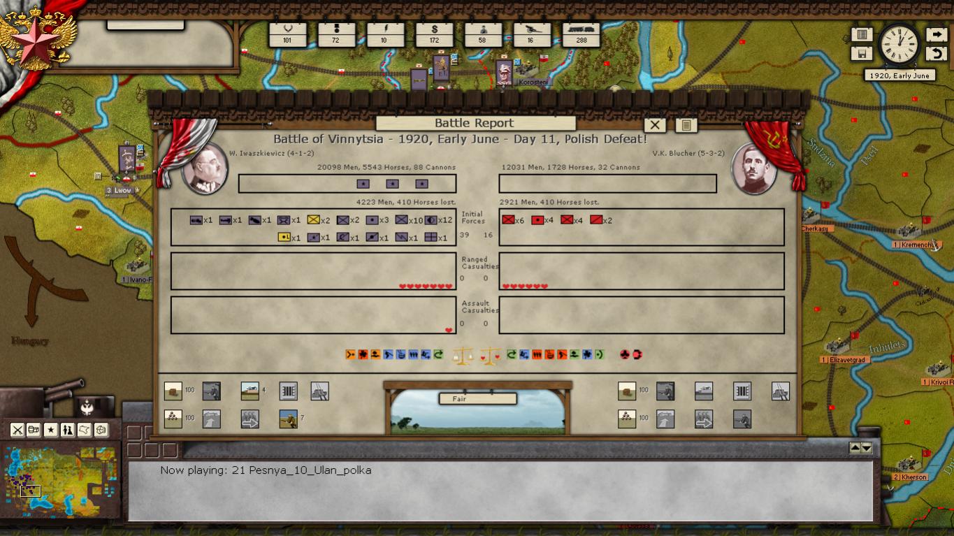 I didn't change my corps compositions(only some minor changes if any), so they look like at the beginning of the scenario. From what I've read on this forum game engine prefers few bigger divisions instead of more but smaller(which is bad I think) so is this a reason of my poor battle performance? What should I do with tanks and armored trains? From the begineing of the scenario I have two independent batalions of tanks which i wanted to use as a mobile reserve to quicly move them where they would be needed. But i think this is waste. Should I place them directly to Corps or Divisions?