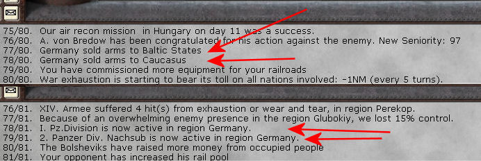 Found some more wrong text messages. The events to sell arms to the Baltic States and Caucasus have re-appeared, but the announcement in the display window states the events have been played. I ran another turn and these two events also will not fire.