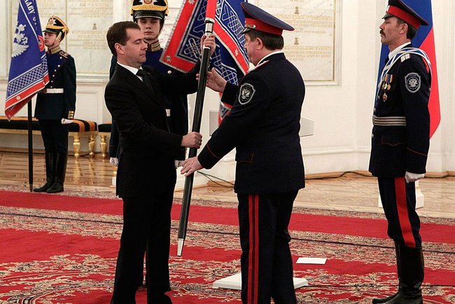 The President presented banners to the Atamans of the Central, Don, Volga Yeniseysk, Trans-Baikal, Irkutsk, Kuban, Orenburg, Siberian, Terek, and Ussuriysk Cossack military societies. All these Cossack military societies have been entered in the State Register.