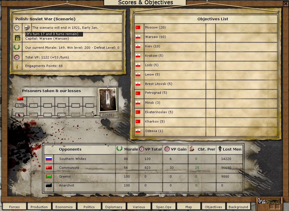 Hello, I'm new to this forum having just bought RUS a couple of weeks ago, the game is great however I have a couple of issues with the Polish-Soviet War scenario. Firstly the scenario is too short to represent a conflict that lasted almost three years from 1919-1921 and there are absolutely no political or diplomacy options during the game. Surely some historical events could be included here such as: