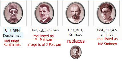 Post 1: The photo of Remezov in the game is wrong, it is of a different Remezov(F.N. Remezov not A. K. Remezov as supposed to!). On the first photo, left to right, sit Efremov, Levandovsky and A. K. Remezov(photo of 1919-1920). On the second, left to right, Voronkov, Remezov, Vasilenko, Kvirkelia, Kirov and Mehonoshin(1919-1920).